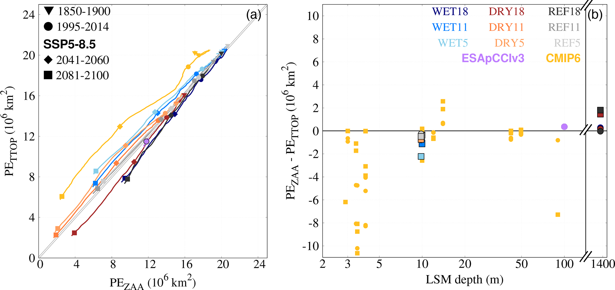 Figure 12(a) Comparison of ZAA (x-axis) vs. TTOP (y-axis) PE estimates (106 km2) for the CMIP6 median and the different members of MPIESM-PePE ensemble (see Fig. 10). Solid lines depict the year-by-year evolution of ZAA vs. TTOP values. The symbols (see legend) illustrate the mean ZAA vs. TTOP values for different periods. ZAA and TTOP PE estimates are filtered with a 15-year moving average. (b) ZAA  TTOP PE differences (106 km2) in 1995–2014 (circles), and 2081–2100 (squares) for the 32 members of CMIP6 ensemble stemming from Steinert et al. (2023a), the nine MPIESM-PePE simulations presented in this work, and the ESApCCIv3 observational PE data (only in 1997–2019). Data sources are sorted by their LSM depth (m, logarithmic x-axis). Note the break in x-axis between 100 and 1400 m.
