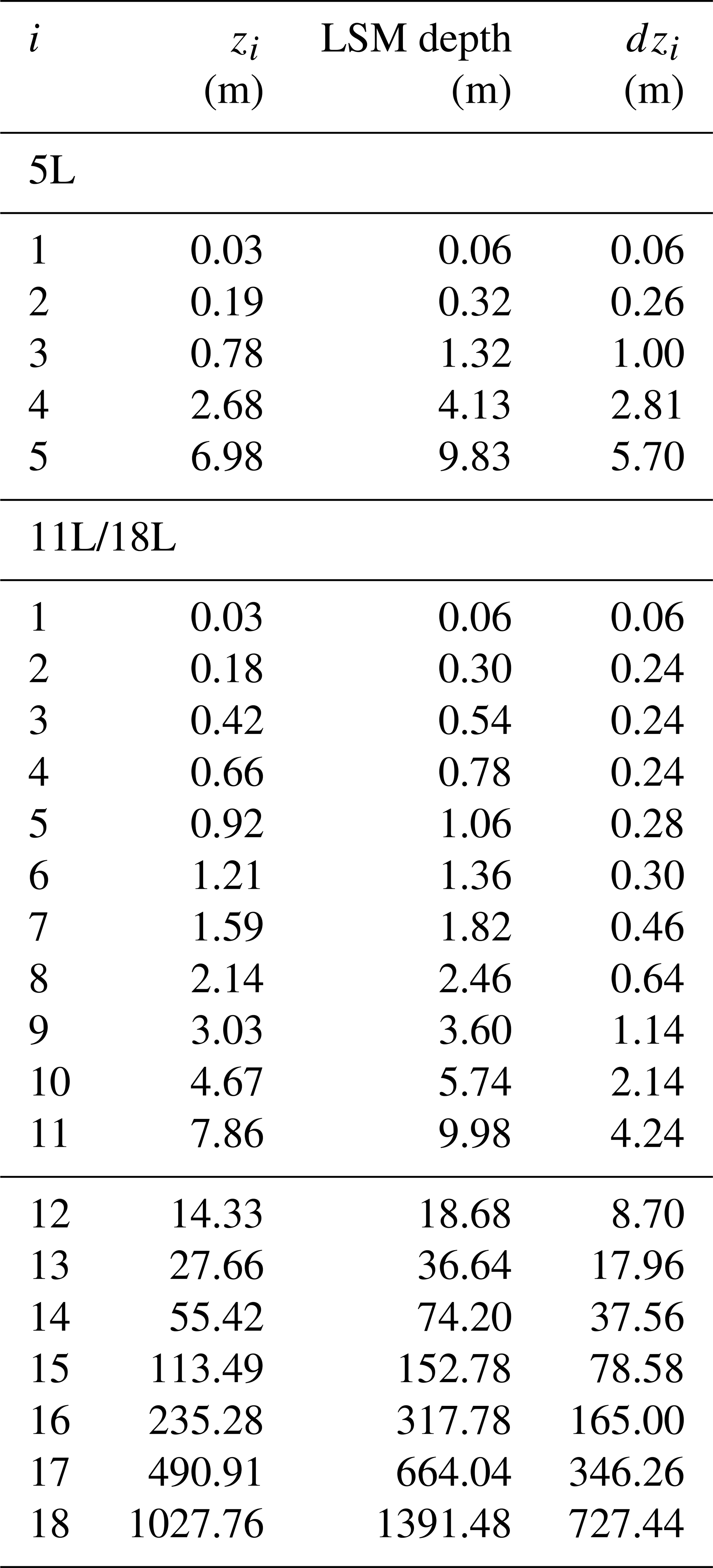 Furthermore, the JSBACH standard vertical scheme of five layers (5L) with a LSM depth of 9.83 m was deepened and refined near the surface. An enhanced vertical resolution accounts for a better representation of hydro-thermodynamic processes near the surface (Chadburn et al.2015, see Table 1). Further, a more realistic deeper LSM depth permits an improved representation of subsurface temperature variability and land heat storage (González-Rouco et al.2021; Steinert et al.2021a; García-Pereira et al.2024a). Thus, two new vertical discretizations are introduced: an 11-layer (11L) scheme with a LSM depth of 9.98 m, and a deepened 18-layer (18L) scheme with a LSM depth of 1391.48 m (Fig. 1). The 11L scheme substitutes the original 5L discretization by enhancing the vertical resolution while keeping an almost identical LSM depth. The 18L scheme shares the top 11 layers with the 11L scheme and adds seven additional layers to reach a depth of 1391.48 m. Imposing such a deep zero-flux bottom boundary condition guarantees that the bottom layer temperature is detached from surface temperature variations at multi-centennial and millennial time scales (García-Pereira et al.2024a). A detailed description of the mid-layer (zi) and LSM depths and thickness (dzi) values of the 5L, 11L, and 18L schemes used in this work can be found in Table 1 and Fig. 1. The design of the layering follows an exponential function of the form dzi=a1exp[a2(i-a2)+a3]+a4 (Oleson et al.2010; González-Rouco et al.2021). In this work, the coefficients a1, a2, a3, and a4 were set to 0.00198, 0.743, 83.77, and 0.0585, respectively. These values for a1–4 aimed at attaining virtually identical LSM depths for the 5L and 11L configurations, while maintaining a thickness of 0.065 m for the first soil layer in the three vertical schemes. The same a1−4 values were used to estimate the thickness of layers 12–18 for the 18L configuration (Table 1).