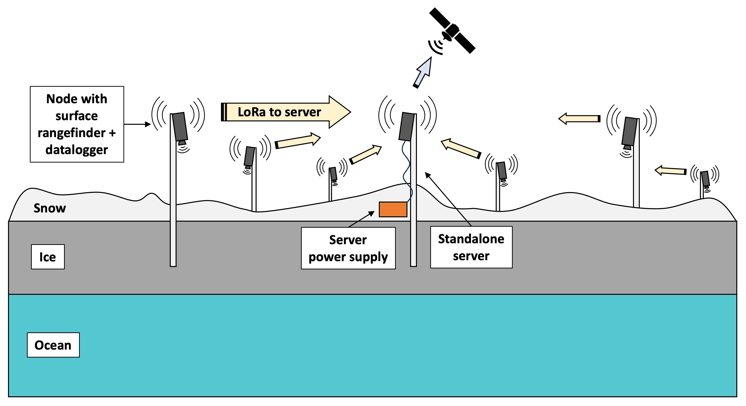 The system's standard network topology is the hub-and-spoke model, where individual nodes (the “spokes”) communicate directly with the server (the “hub”). This network topology is simple to implement and is also typically the least power-intensive network model. In this topology, network sizes are limited by the 10–20 km nominal LoRa range. This range assumes line of sight between node and server. However, range and reliability may be reduced in complex terrain, such as in highly deformed sea ice, where direct line of sight between the server and each node may not be possible since the sensing unit sits approximately 1.44 m above the ice surface (Fig. 3), while ridges can reach a height of several meters (Duncan et al., 2018). We implemented an alternative mesh network topology to address this limitation, where data from out-of-range nodes can be relayed to the server through peers. We use a naive flooding protocol (Zahn et al., 2009) with acknowledged packet receipt. A detailed description of the node-side mesh network implementation is included in Appendix B.