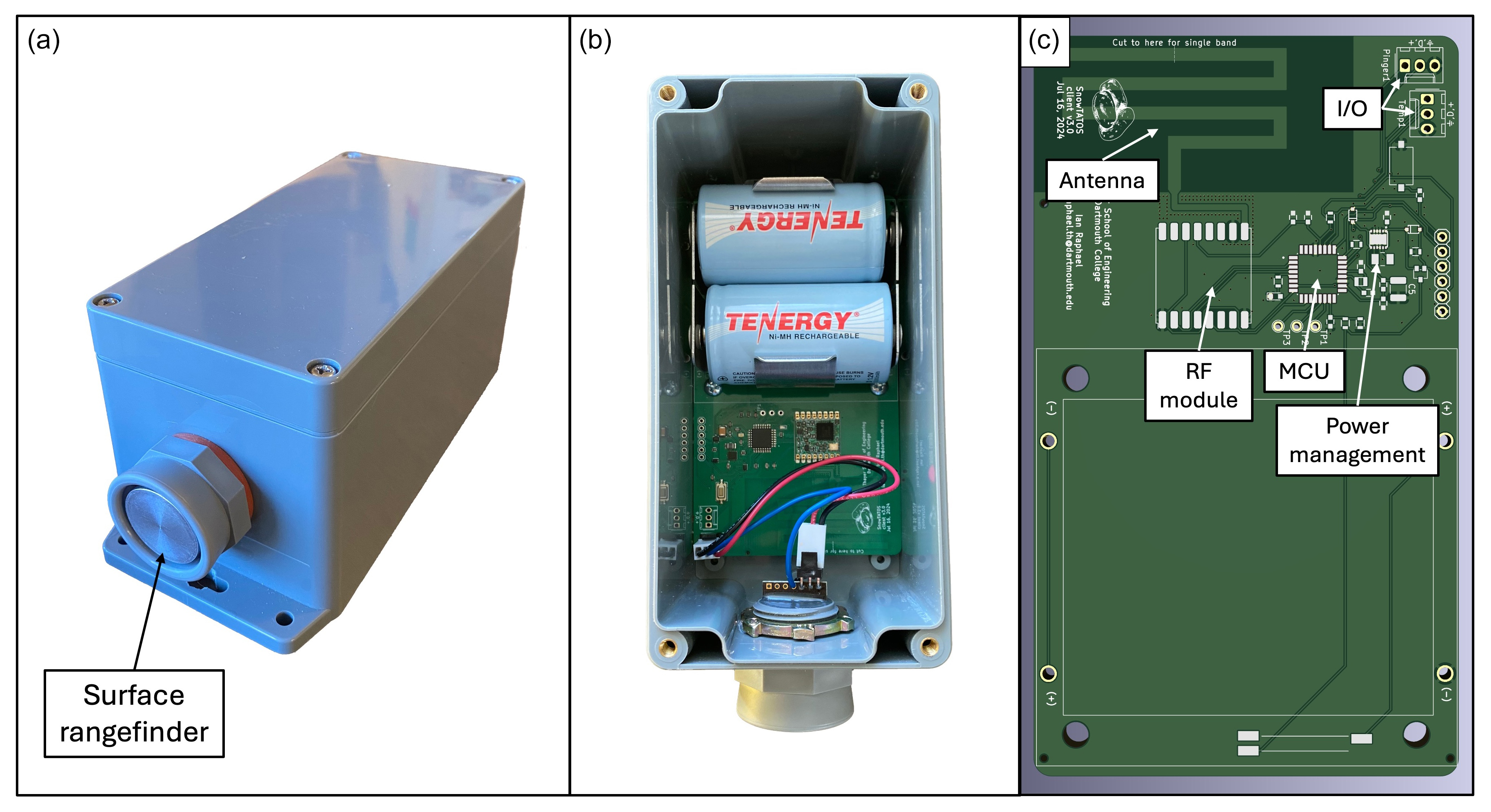 Figure 2SnoTATOS node sensing unit. Panel (a) is a photograph of a SnoTATOS sensing unit, showing the ABS (acrylonitrile butadiene styrene) plastic enclosure and ultrasonic surface rangefinder mounted in the sidewall of the enclosure. Panel (b) is a top-down photograph of the sensing unit with lid removed, showing the printed circuit board (PCB), rangefinder wiring harness, and battery bank. Panel (c) shows an annotated digital model of a node PCB with key features identified.
