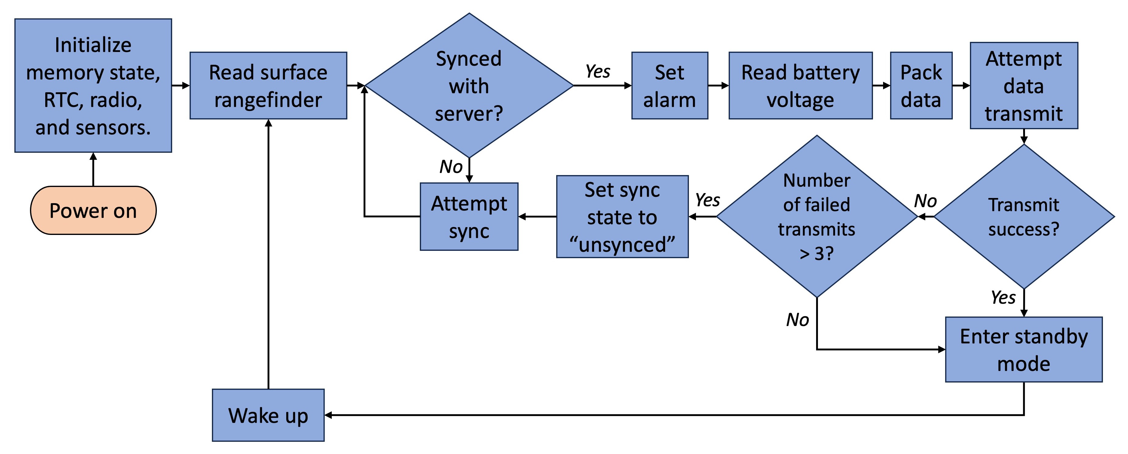The system software is written in C and C++, using the Arduino hardware abstraction layer (HAL) to interface with the MCU. The nodes follow the high-level logical flow shown in Fig. 4. When powered on, the node enters the Setup function, where it initializes the memory state, system clock, radio module, and rangefinder and sets input/output pin states. The node then moves into the Loop function, where it will remain for its lifetime unless it is power-cycled. In Loop, the node first samples the rangefinder to obtain a snow depth reading at “wake-up” time. The node then checks its synchronization state. If it is not synced with the server (as is the case upon initial power-up), it will wait at this stage until it receives a synchronization broadcast message from the server. After synchronizing with the server, the node immediately sets an RTC (real-time counter; not to be confused with real-time clock) alarm to wake after the appropriate elapsed time (the sampling interval). The node then reads its battery voltage, packs this and the rangefinder data into a buffer, and attempts to transmit the buffer to the server. If the transmission is successful and acknowledged by the server, the node depowers all unnecessary peripherals and enters a deep-sleep state until triggered by the RTC alarm. However, if more than three unsuccessful/unacknowledged transmissions occur, the node returns to an unsynced state and remains awake until resyncing with the server. We implemented this failsafe to prevent network failure in case of clock drift or other errors resulting in network desynchronization over the course of the deployment.