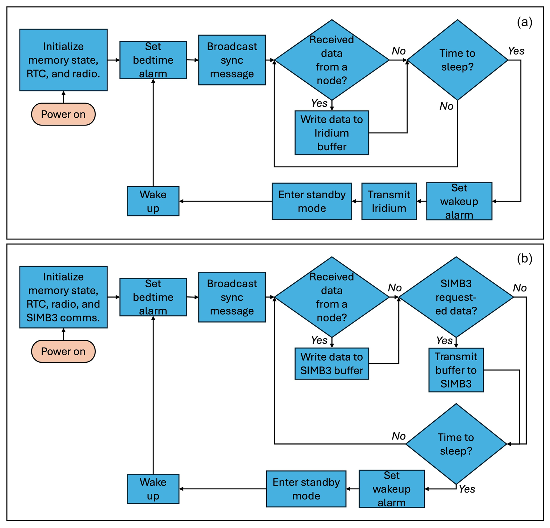 If the server is operating in standalone mode, it continues to listen for data from nodes until it is time to sleep. When it is time to sleep, the server sets a wake-up alarm corresponding to the sampling interval, transmits its data via Iridium, and enters standby mode. If the server is integrated into a SIMB3, the server adds a second stage during its waketime loop. In the second stage, the server checks to see if the SIMB3 has requested the data from the server. If the SIMB3 has requested data, the server passes the buffer to the SIMB3, then resets the buffer to default values. The server continues checking these two conditions (“Received data from a node?” and “SIMB3 requested data?”) until it is time to sleep, at which point it will set a wake-up alarm and enter standby mode. Despite the server checking the “SIMB3 requested data?” condition multiple times, the SIMB3 is expected to request data only once during a given sampling interval. However, due to communications protocols between the SIMB3 and the server, it is beneficial to respond to any hypothetical SIMB3 request as legitimate, even if the server responds with default buffer values.