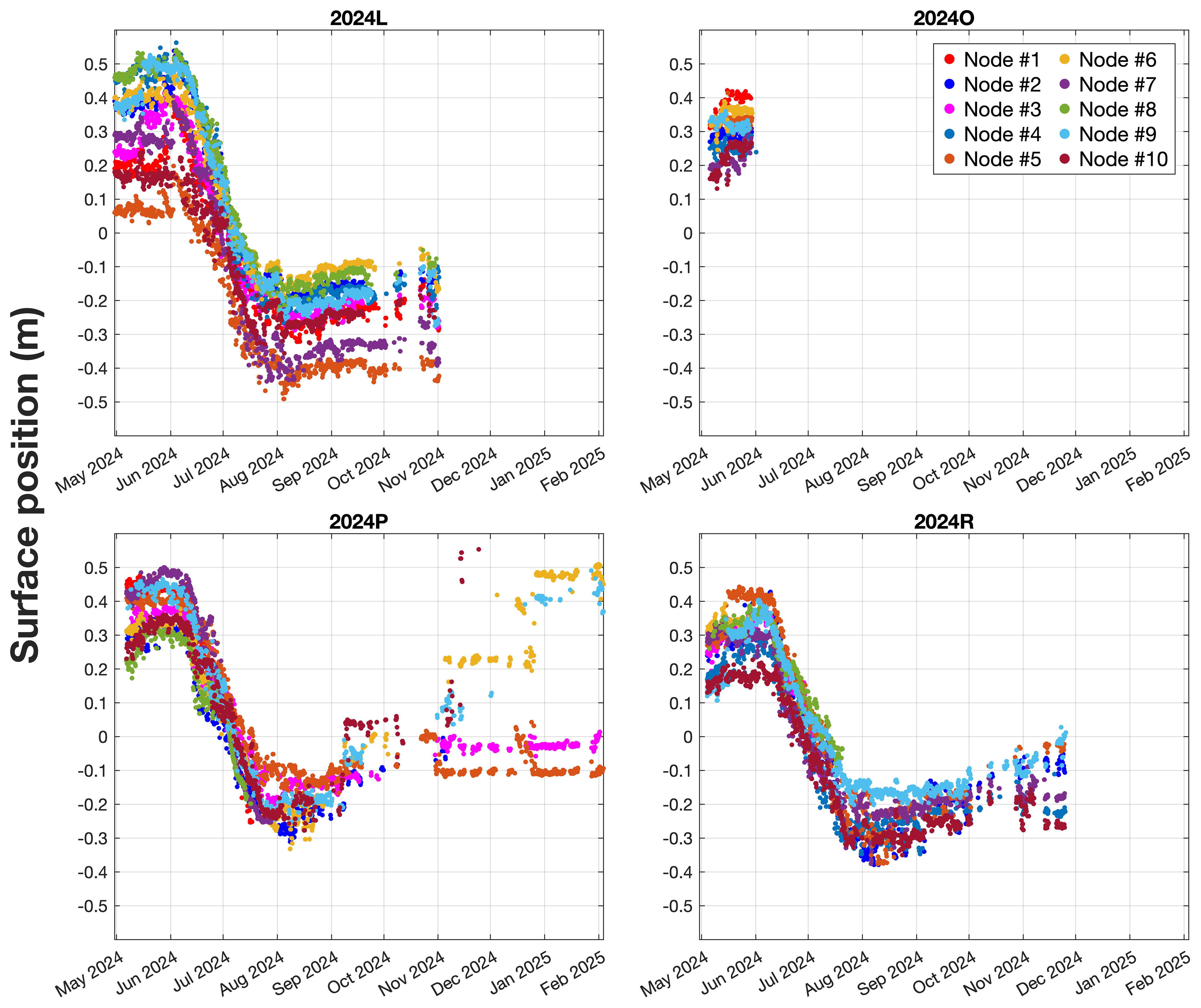 Figure 7Time series scatterplots of surface position at four SnoTATOS networks. Time series data of surface position are shown for each node at the four ARCSIX SnoTATOS networks. “Surface position” is the position of the surface sensed by the ultrasonic rangefinder (air–snow or air–ice interface) relative to the initial snow–ice interface (surface position 0). Each node initially demonstrates a positive surface position value, indicating a positive snow depth. Snow depth increases until around early June at all nodes. Snowmelt then begins around mid-June, continuing at each node until the surface position reaches 0, indicating complete snowmelt and the onset of ice surface melt. Ice surface melt continues until early August. From that point on, any positive change in surface position indicates new snow accumulation.
