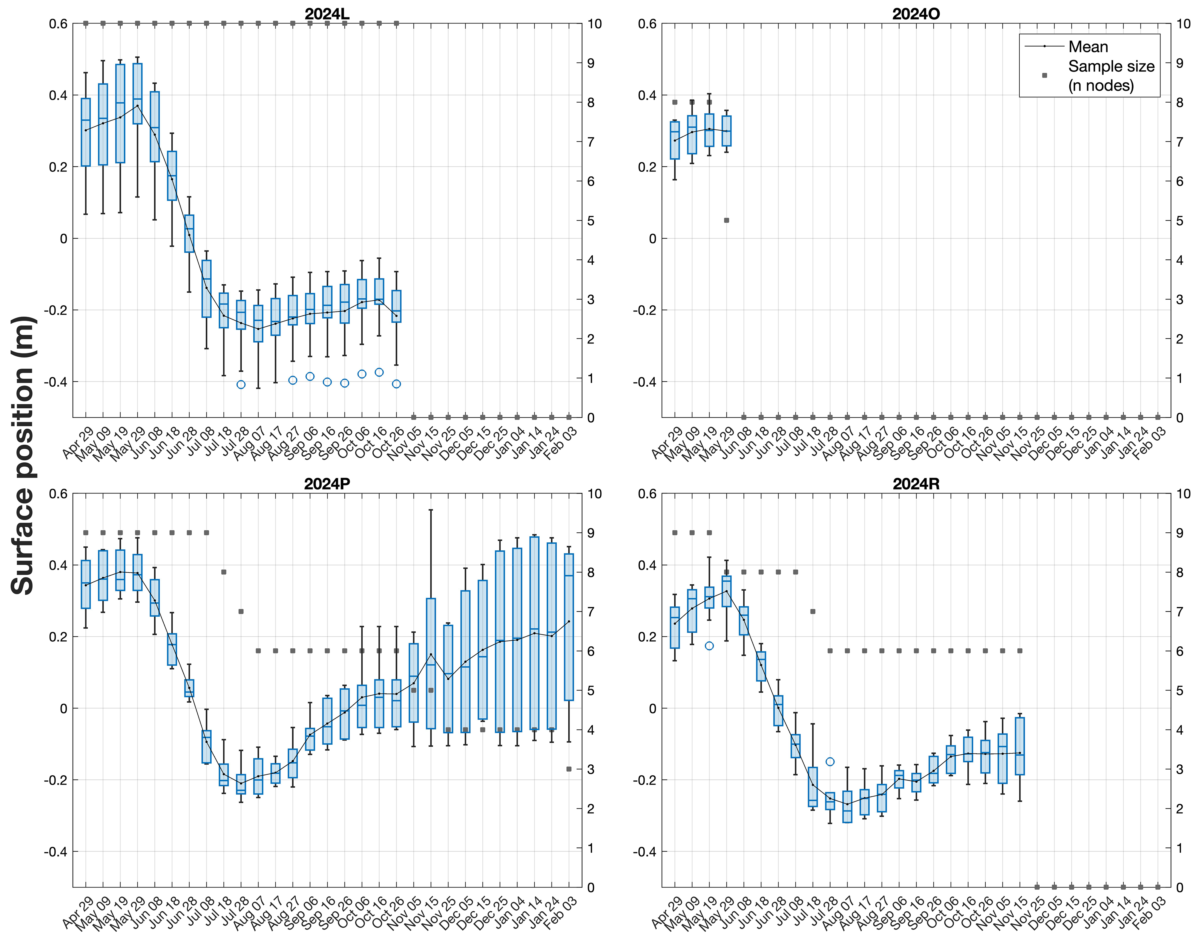 Figure 8Box-and-whisker time series of surface position at four SnoTATOS networks. Each box-and-whisker shows the spatial distribution of the 10 d average surface position for a given network. The lower and upper edges of each box show the first and third quartiles, the bar in the box shows the median, and the whiskers indicate the minimum and maximum non-outlier values. Outliers are shown as open blue circles and are defined as more than 1.5 times the interquartile range lesser or greater than the first and third quartiles, respectively. The small, dotted markers and interpolated line show the spatial mean for each 10 d bin. The square grey markers indicate the sample size (number of nodes) included in the distribution at each time step, with a separate y axis shown on the right of each pane.