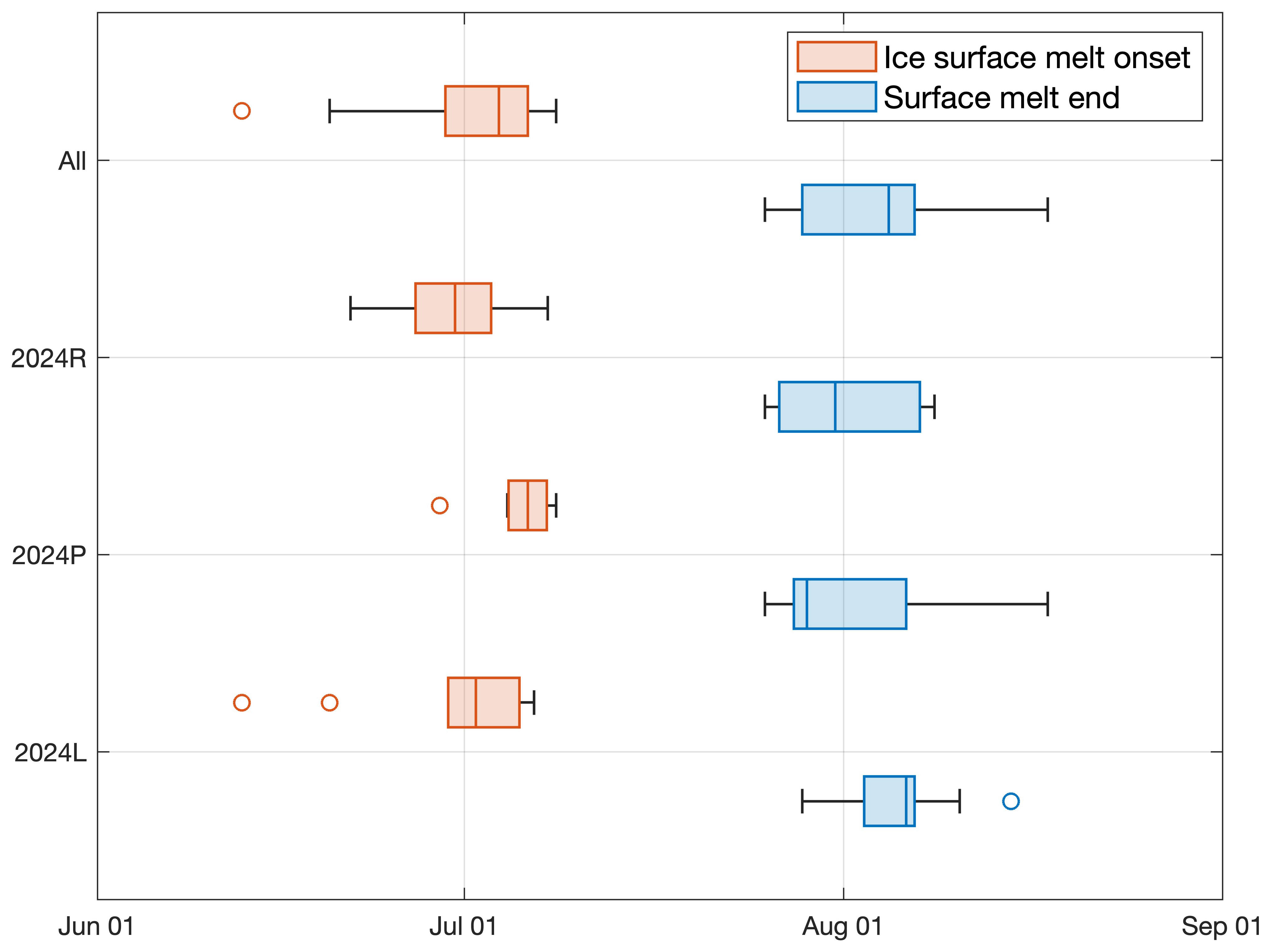Figure 9Box-and-whisker plot showing the distribution of ice surface melt onset and surface melt end dates. Ice surface melt onset is shown in orange, and surface melt end is shown in blue for the nodes within each network. Network 2024O is excluded since the network stopped reporting before surface melt onset. “All” shows the combined distribution of all active nodes in 2024R, 2024P, and 2024L.