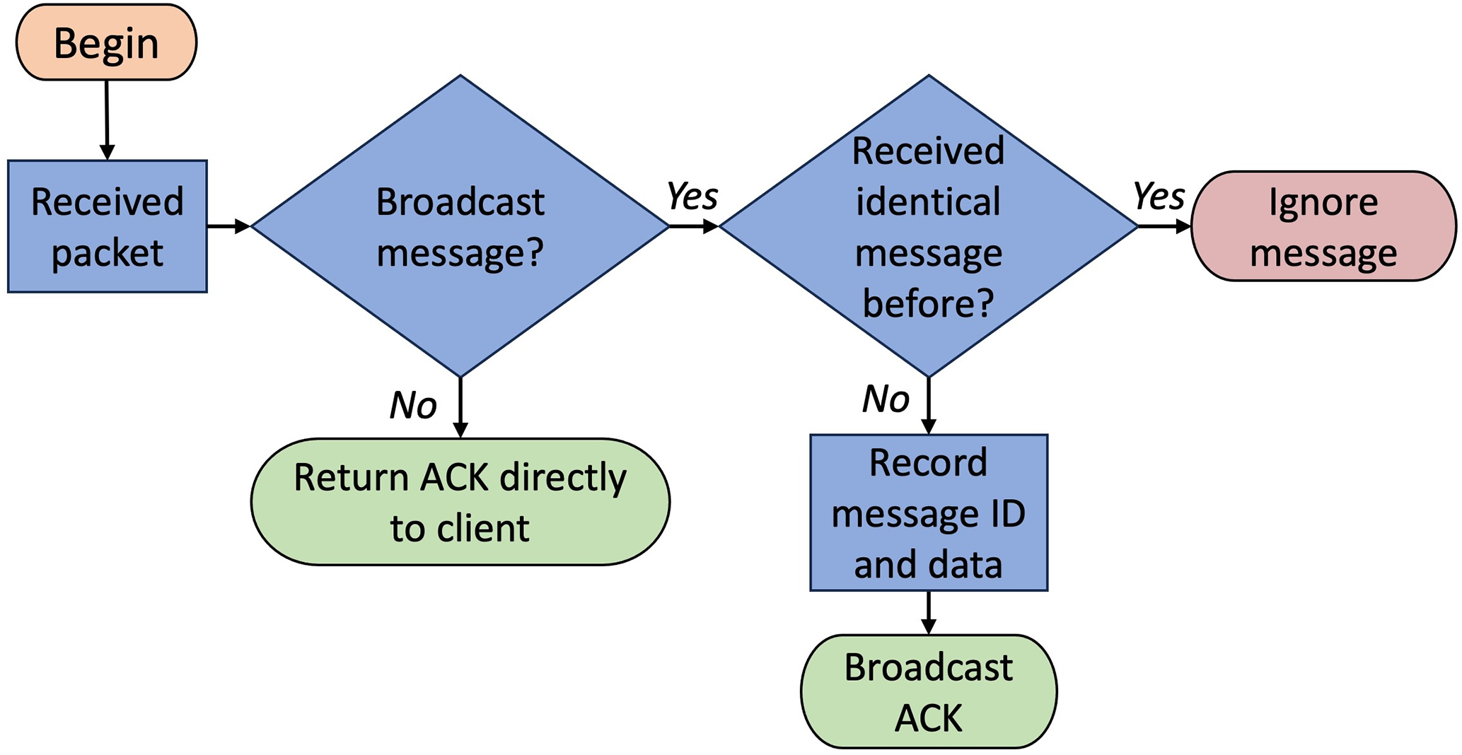 In the mesh network model, whenever a node receives a message, it first checks whether it is a broadcast message. If it is not a broadcast message, it is implicitly a unicast ACK message from the server. The node confirms that it is an ACK message and that it is addressed to itself, and if so, it records the acknowledgement. If it is a broadcast message (either from the server or via a peer), and it is not a message that it has already received, the node will first note the message ID, then process the message contents. If it is addressed to itself, it is implicitly a broadcast ACK message originating from the server (likely received via a peer). If the node confirms that it is an ACK message with its own address, it records the acknowledgement. If it is not addressed to itself, it could be a data message originating from a peer and addressed to the server, an ACK message originating from the server and addressed to a peer, or a sync message originating from the server and addressed to the entire network. In the first two cases, the node rebroadcasts the message without further processing. In the latter (sync) case, the node first sets its synchronization flag, then rebroadcasts the message to the network.
