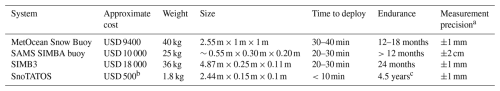 Table 1Specifications of several polar snow depth measurement systems (all specifications are per unit/station).