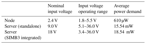 We conducted similar power tests for the server, finding an average current draw of 1.03 mA at Vs=18 V, yielding an average power demand of 18.54 mW. This is approximately 30 % of the SIMB3's power budget (Planck, 2021), yielding an estimated endurance of approximately 560 d, or slightly more than 1.5 years. Operating in standalone mode, the power supply can be reduced to Vs=3.4 V, increasing efficiency and reducing average power demand to approximately 2500 µW. This produces a nominal endurance of 4.4 years with a 96 Wh battery bank (eight 10 000 mAh D-cell batteries).