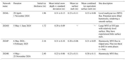 where ρi is the density of sea ice (0.9 g cm−3; Perovich et al., 2003), ρs is the density of snow (0.3 g cm−3; Sturm et al., 2002), Hsnow is the observed snowmelt, and Hsie is the SIE melt. We combined Hsie with the observed ice surface melt to determine the total ice equivalent surface melt for each station. Average ice-equivalent melt was 0.33 m at 2024L, 0.31 m at 2024P, and 0.30 m at 2024R, indicating very similar net surface melt across the region. Net ice-only surface melts were also quite similar, with 0.23 m at L, 0.20 m at 2024P, and 0.23 m at 2024R. The network with the deepest initial snow depth (2024P) also had the smallest ice melt, presumably because deeper snow increased albedo and physically protected the ice, delaying surface melt onset (Fig. 9). Compared to variability between regions or years within the Arctic (e.g., Perovich et al., 2014, or Planck et al., 2022), however, these variations in mean behavior are quite small.