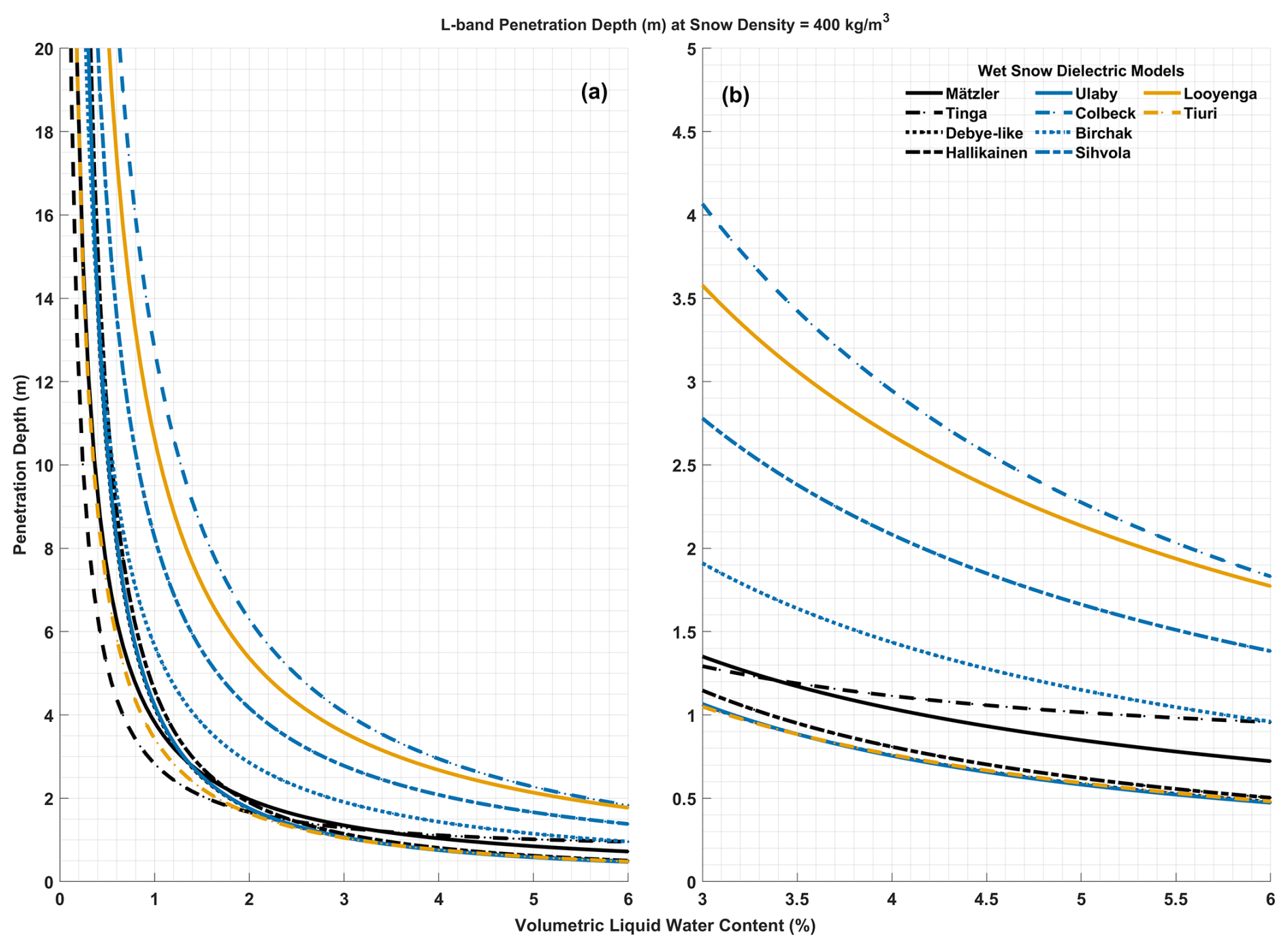 Aside from above models, we considered purely empirical Tiuri et al. (1984) model that used experimental data to measure the complex dielectric constant of wet snow for frequencies 859 MHz–12.6 GHz. Their results suggest that the complex dielectric constant of snow is largely unaffected by the snow structure. In dry snow, the dielectric constant is primarily determined by the density. For wet snow, both the imaginary part () and the increase in the real part due to liquid water ( show a similar dependence on volumetric wetness, which were empirically modelled as,