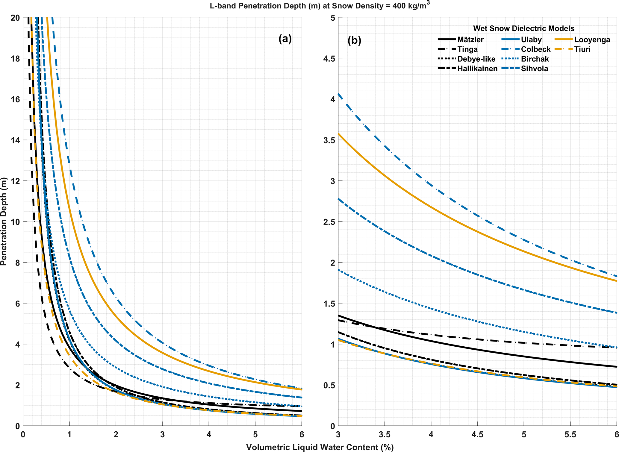 The differences in the imaginary part of the dielectric constants are manifested in the penetration depth, an important variable for liquid water quantification. Figure 3 illustrates the penetration depth of L-band (1.41 GHz) signals estimated by the models for a snow/firn density of 400 kg m−3 as a function of vw in the 0 %–6 % range (Fig. 3a) and the 3 %–6 % range (Fig. 3b). All models predict an exponential decay of penetration, but they exhibit substantial differences with respect to one another, though the range generally reduces with increasing vw. For vw of 1 %, 3 %, and 5 %, the model estimates of penetration depth range between 2.8–12.8, 1–4, 0.5–2.3 m respectively. The Tinga and Ulaby models provide the lowest estimate of penetration depth for vw <2 %, and vw>2 % ranges respectively, while the Colbeck model gives the highest estimate for the entire vw range as it estimates the lowest loss factor among all the models. The Debye-like, Hallikainen, and Ulaby models closely follow each other. Mätzler model provides an intermediate estimate of penetration depth. The empirical Tiuri model aligns with Mätzler model for low vw (<1 %); however, it matches better with Debye-like, Hallikainen, and Ulaby models for higher vw (>2 %). The exponential models, consistent with their complex dielectric constant, lie in between.