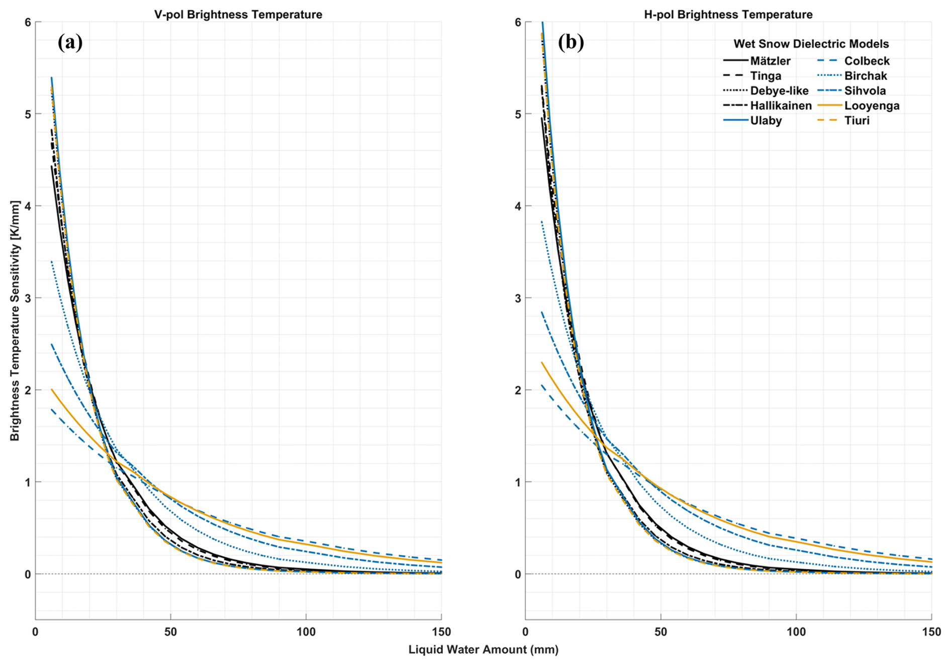 The Ulaby and Tiuri models show the highest sensitivity at lower LWA, closely followed by the Hallikainen, Tinga, and Mätzler models. However, the sensitivities of these models fall below tenths of K mm−1 for LWA >70 mm for both V- and H-pol. The Birchak, Sihvola, and Looyenga models demonstrate moderate sensitivities, while the Colbeck model presents the lowest sensitivity among the models for lower LWA; however, their sensitivities also decrease slowly with LWA, and they remain reasonably sensitive for the higher end of the LWA. Although, the first group of models shows almost negligible sensitivities close to or beyond 100 mm of LWA, no models showed perfect 0 or negative sensitivities within 150 mm of LWA. However, it is obvious that for a majority of the models the uncertainty of the retrievals at LWA >60–70 mm will be significantly higher.
