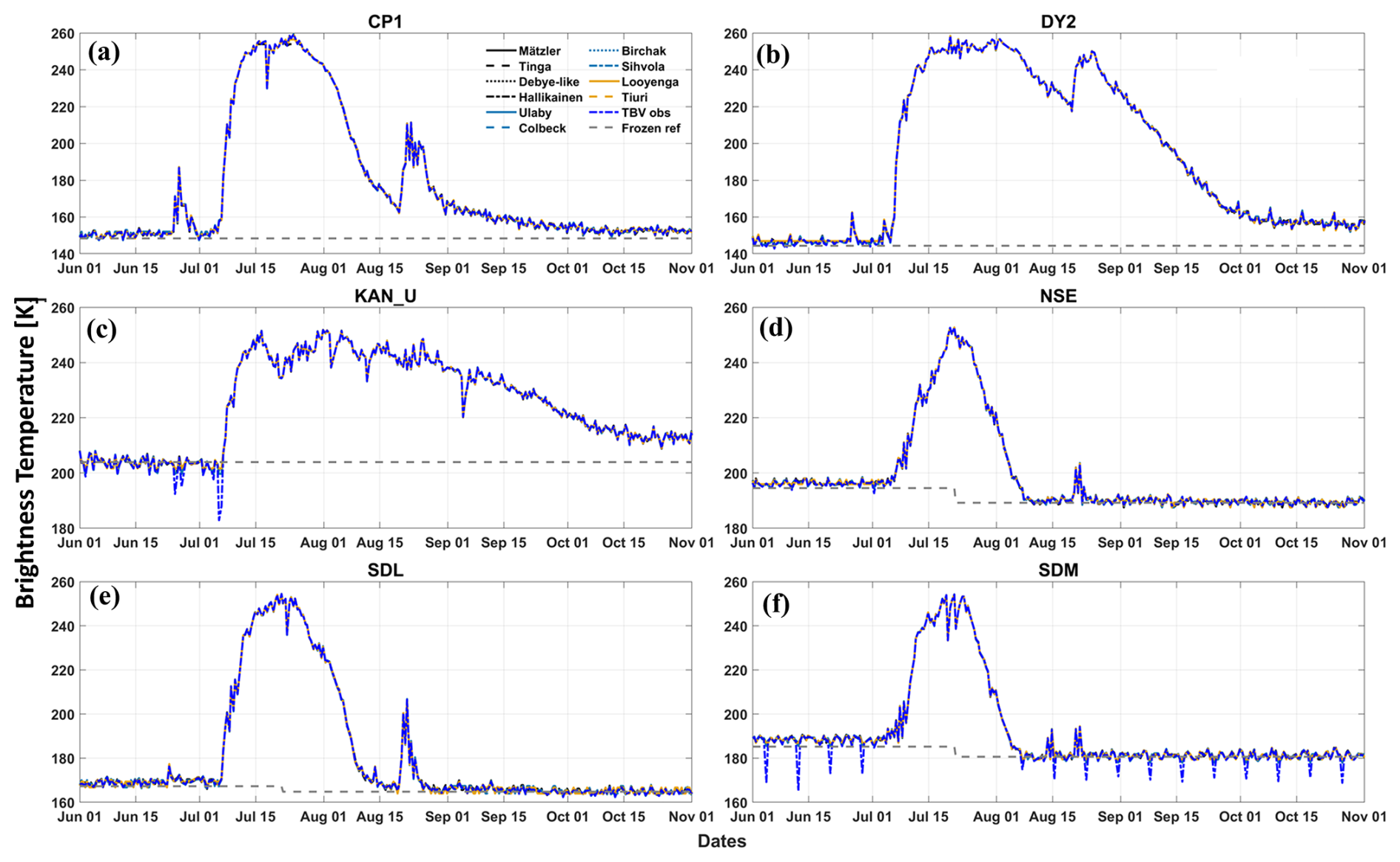 CP1 and DY2 are both perfect representatives of the Greenland percolation zone, with moderate upper layer density and numerous ice layers and pipes due to annual refreezing of seasonal melt (Jezek et al., 2018; Vandecrux et al., 2024). These ice layers significantly attenuate microwave emissions from deeper layers giving very low frozen season TBs (∼148 and 144 K, respectively). At the same time, these sites also provide high TB sensitivity to liquid water during peak melt season as the effective emissions approaches close to unity (>0.95, see Fig. 8a–b). At both AWS locations, the TBs remained elevated through October compared to their pre-summer frozen references.