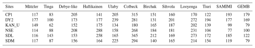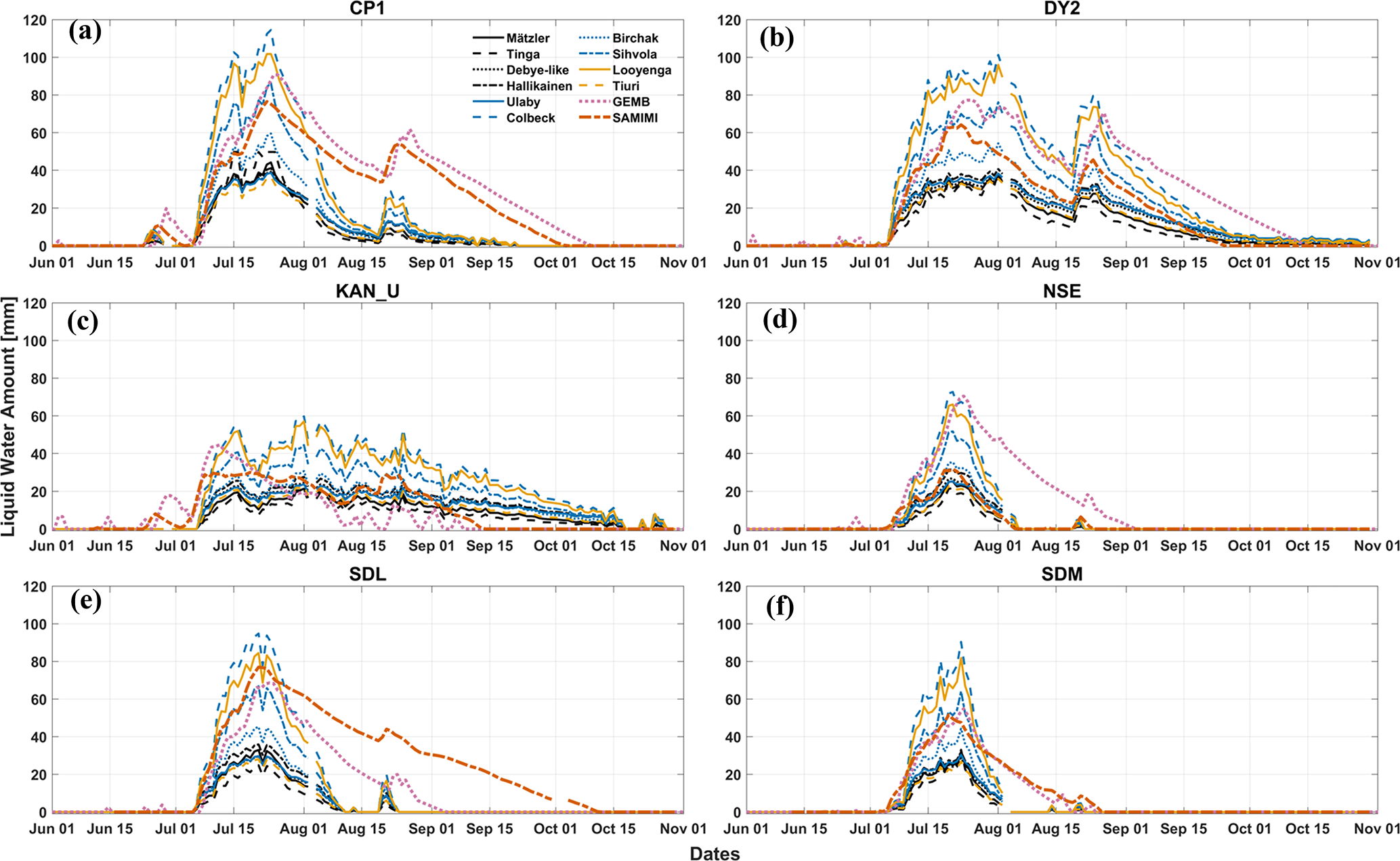 The 2023 melt year experienced above average melting (Poinar et al., 2023), though the annual average temperatures reflect both a cooler accumulation period and warmer melt season (Poinar et al., 2023). All sites have very stable but different frozen season TB, representative of their different subsurface backgrounds. Some occasionally decreasing spikes before and after the melt season at the SDM site are artifacts of the rSIR processing (Long and Brodzik, 2024, confirmed through personal communications). Since the simulated TBs were optimized with the mean observed TBs during frozen season, they are less affected by these artifacts during frozen season. Throughout the summer season at each of the AWS location, the simulations with different models closely align with the observations with no significant bias. The agreements are so close that the simulated TBs are almost overlaid by the observed TBs (Fig. 8). But this was obtained with different combinations of twet and vw, resulting different LWA.