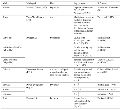A summary of the above-mentioned wet snow dielectric mixing models is given in Table 1.