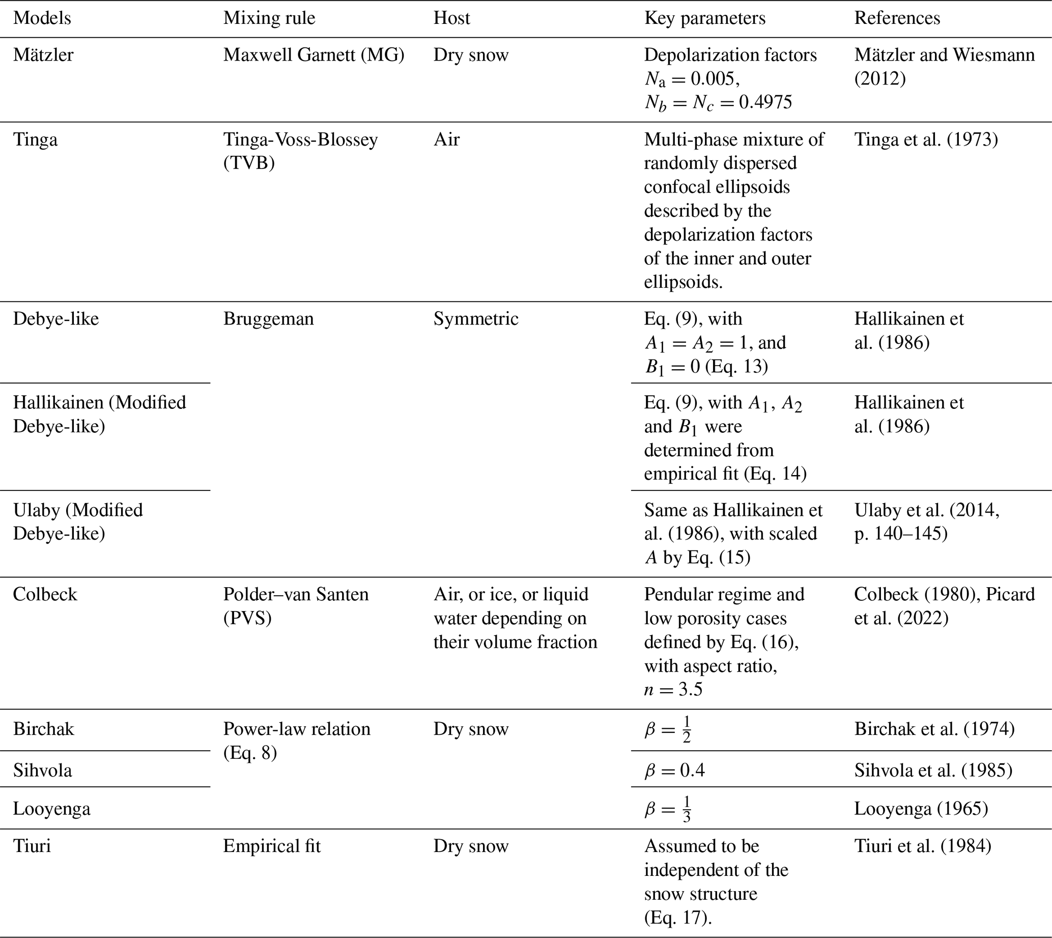 In this subsection, we discuss ten commonly used dielectric mixing models for estimating the complex dielectric constant of wet snow. Mätzler model (Mätzler and Wiesmann, 2012; used in MEMLS V3) uses the MG rule to compute the effective dielectric constant of wet snow as a two-phase mixture of liquid water inclusions in a dry snow background (host) with experimentally determined depolarization factors Na=0.005, (representing a prolate spheroidal shape of the inclusion) from Hallikainen et al. (1986) and Matzler et al. (1984),