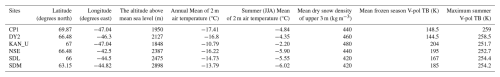 Figure 8 compares the simulated V-pol TBs with the observed V-pol SMAP TB time series (blue dash-dotted line) along with the frozen season TB references (dashed grey lines), during the 2023 melt season at six PROMICE and GC-Net AWS. The AWS were selected based on their varying geographic locations in the percolation zone, climatic record of melt, and in situ data availability for the validation. Table 2 shows the geographic locations, elevations along with the mean 2 m air temperature, the mean dry snow density of the upper 3 m, and the mean pre-summer frozen season V-pol L-band TB at these sites.