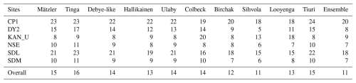 The sensitivity of TB to LWA change decreases with increasing LWA. We compute the change of TB for every 1 mm change in LWA, which is shown for V- and H-pol TB in Fig. 7. Here we considered a vw of 3 %, and increased the wet layer thickness from 0.1 to 5 m. The sensitivities at H-pol are higher than at V-pol for all models. The sensitivity of TB to the change of LWA decays exponentially across all models, falling below 1 K mm−1 at <50 mm of LWA for V- and H-pol. For models that demonstrate higher sensitivity for lower LWA, the sensitivity declines more sharply and saturates at relatively lower LWA (after which they show negative sensitivity, i.e., TB decreases as LWA increases; however, we did not consider negative sensitivity regime in this manuscript as this happens at oversaturated LWA not typical for the percolation zone of the Greenland Ice Sheet, see Sect. 1).