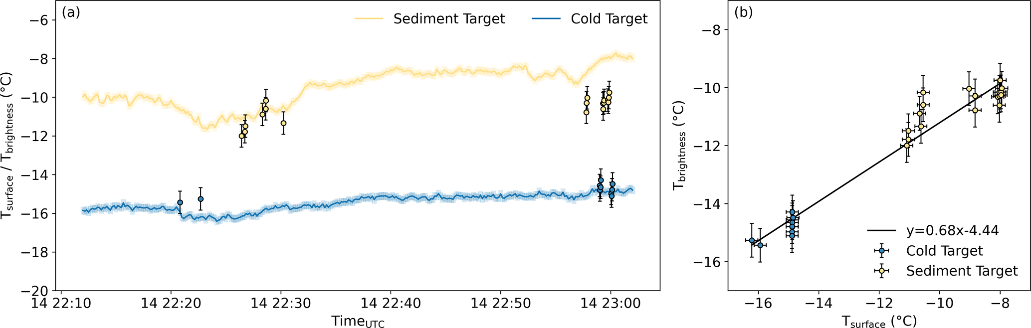 Figure 4(a) The time series (line plots) of surface temperatures measured on 14 November 2022 with the two Apogee sensors (Table 1) targeting snow with visible sediment particles (yellow), and clean snow without visible sediment particles (blue). The dots are Tbrightness from all TIR images (NUC corrected) that contain the Apogee sensor's footprint with the temperature anomaly RMSE of 0.58 °C that results from the correction equation (Eqs. 2 and 3). (b) Scatter plot with ground-based temperatures measured by Apogee sensors (Tsurface) at the two targets against the Tbrightness from TIR images that encompass the footprints of these sensors. The black line is the best linear fit. The error bars indicate the temperature anomaly RMSE of 0.58 °C and the manufacturer's uncertainty for the Apogee sensor, respectively.