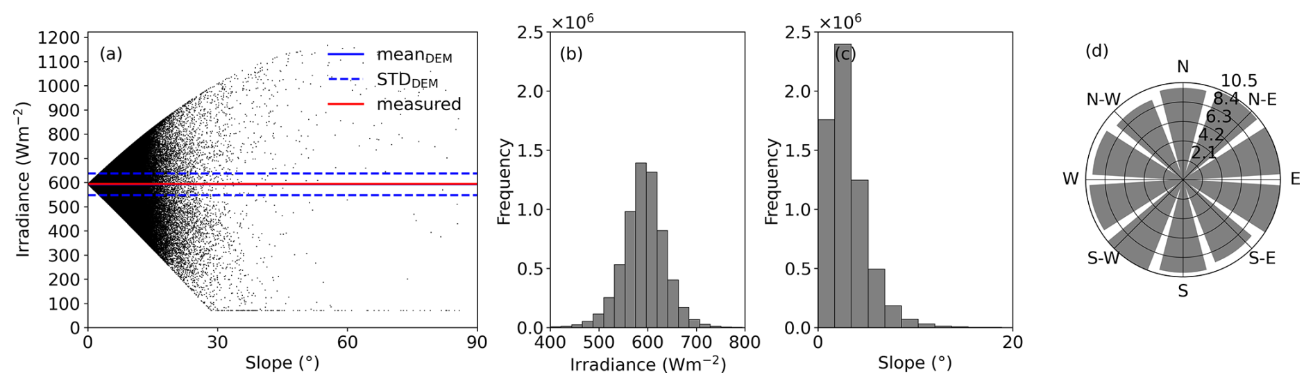where Θ is the incidence angle between the Sun and the local surface normal, and M is the shade mask (0 for shaded cells, 1 for sunlit cells) following Corripio (2003). We note that multiple scattering between snow facets can enhance irradiance, particularly in steep and complex terrain (Robledano et al., 2022). However, given the relatively shallow slopes at our site, we assume this effect is minor and do not account for it in our model.