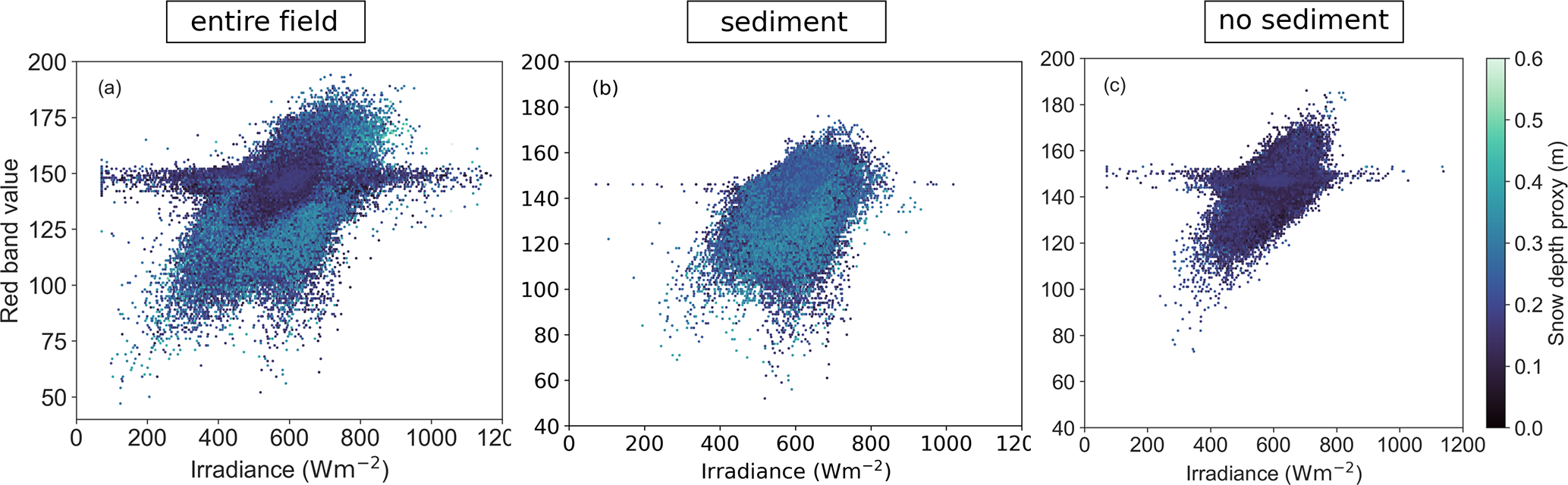 To test if snow surface temperatures are driven by snow depth (given relatively uniform sea ice thickness), we first explore the correlation between the snow depth proxy and snow surface temperature. Given the visible sediment patches and their strong effect on albedo (Warren and Wiscombe, 1980), we split the data into three sub-datasets: (1) the “entire field” dataset, containing 6 211 943 data points (approximately 99.9 % of the original dataset), (2) the “sediment” dataset, which includes 285 396 data points (approximately 5 %) from areas with visible sediment and some clean snow, and (3) the “no sediment” dataset, containing 341 473 data points (approximately 6 %) representing areas with visible clean snow only.