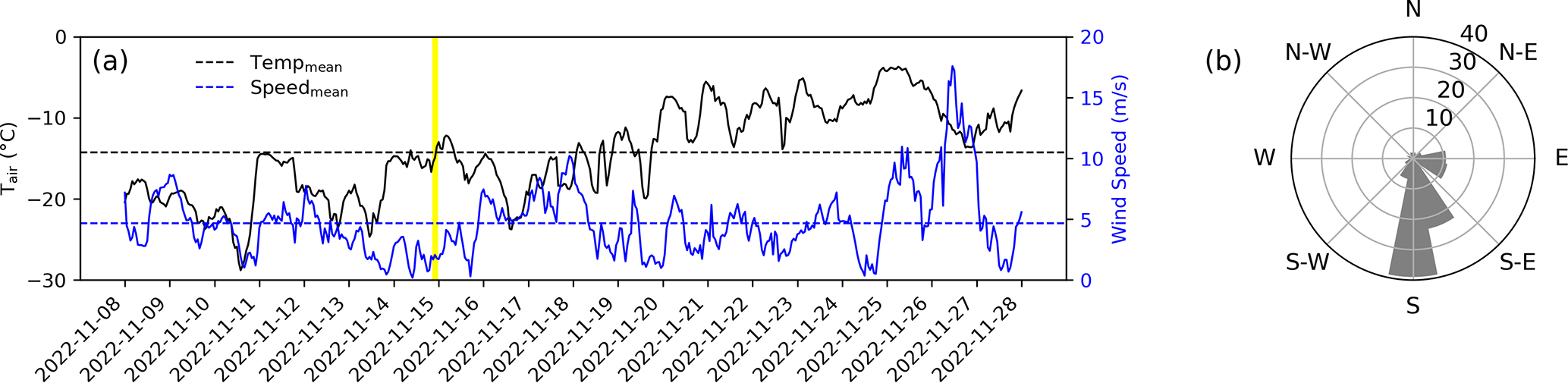 Figure A2(a) Hourly averaged air temperature and wind speed during field campaign at CS test field. The vertical yellow bar indicates the UAV mission. (b) The prevailing wind directions at the CS test field during the field campaign.