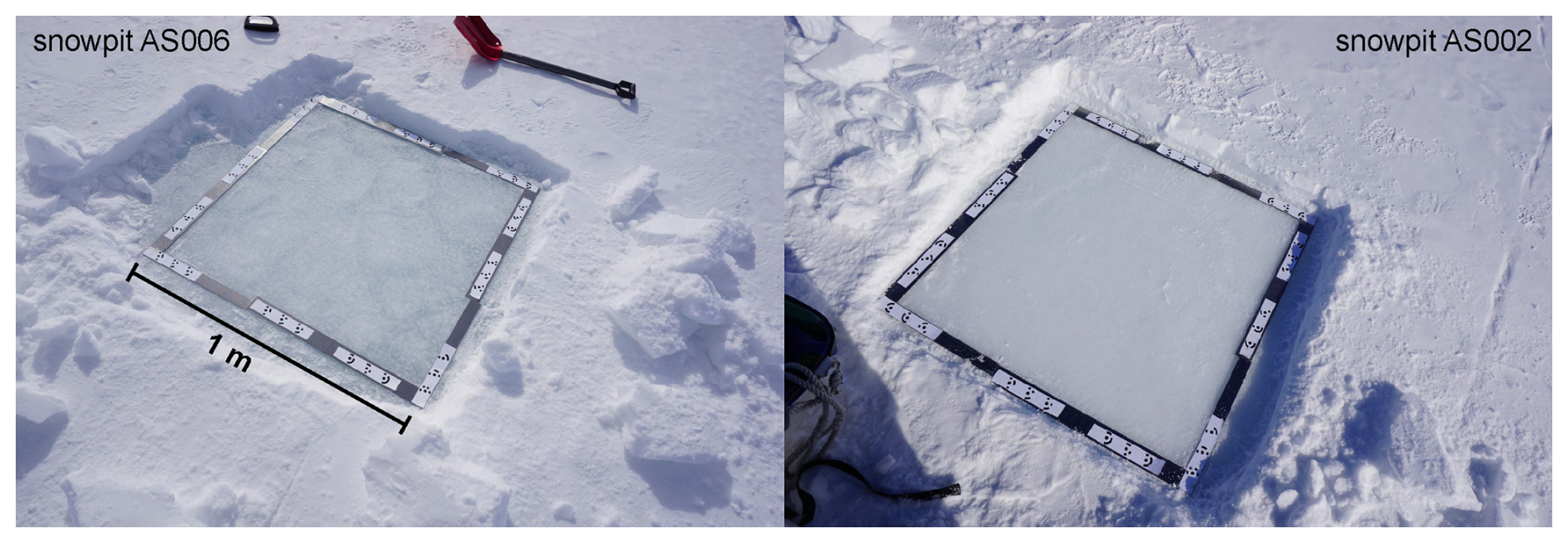 Figure A3Sea ice surface at two different snowpit locations (AS006, AS002) inside the 200 m × 200 m CS test field during our field campaign showing the flat and smooth sea ice surface.