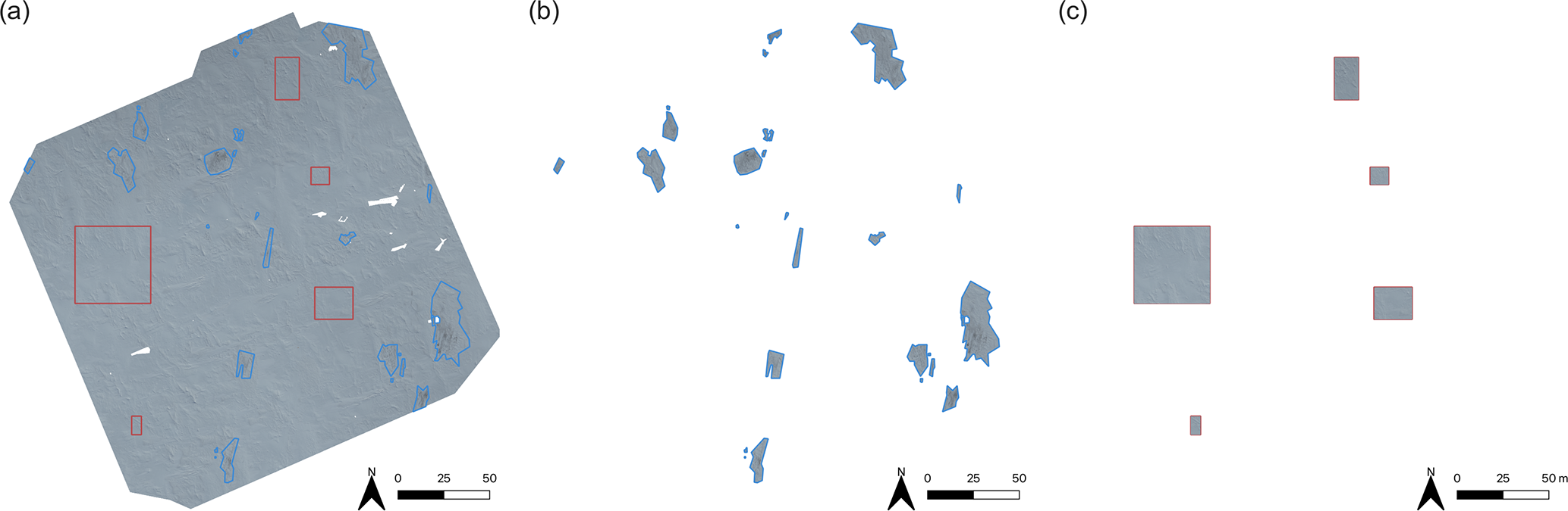 Figure A5Masks used to create the three sub-data sets “entire field” (a), “sediment” (b) and “no sediment” (c) in the RGB orthomosaic.