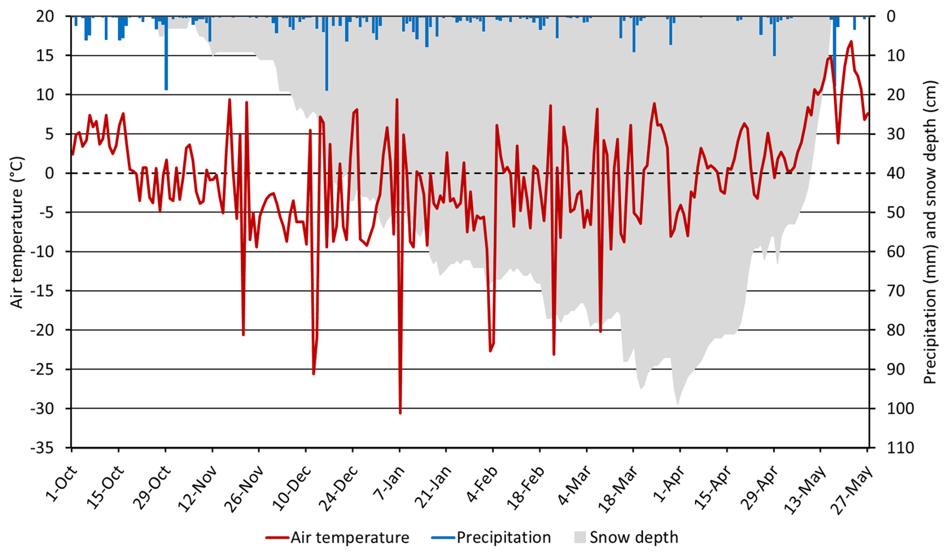 The climate in Sodankylä is defined by short but relatively warm summer season and a long and cold winter, with snow present from October to May. Taiga snow is dominant, with thick layering of depth hoar at the base of the snowpack (Anttila et al., 2014). Meaningful rain-on-snow events occur in November and early December (Bartsch et al., 2023). Between 1991 and 2020 at the FMI Sodankylä Tähtelä weather station, the average yearly precipitation was 543 mm with an average yearly maximum snow depth of 91 cm that ranged from 65–127 cm. The average air temperature was 0.4 °C, the average minimum was −4.2 °C, and the average maximum was 4.8 °C. The absolute minimum temperature was −49.5 °C while the absolute maximum was 32.1 °C. The mean annual air temperature has increased by 0.07 °C from 2000–2018 (Bai et al., 2021) and is expected to continue. Between the winters of 2007/08 to 2013/14 around FMI-ARC and the Sodankylä Geophysical Observatory, the maximum SWE ranged approximately from 150–250 mm (Essery et al., 2016). For the winter of 2022/23, a maximum snow depth of 99 cm was recorded at the Sodankylä Tähtelä weather station on 31 March 2023, with rapid snow melt in April and early May (Fig. 2). The average air temperature was generally near or below freezing in winter and contained relatively low precipitation. The site generally contains low wind speeds that limit windblown snow redistribution, with a monthly average of 2.5–2.9 m s−1 above the forest canopy (Meinander et al., 2020).