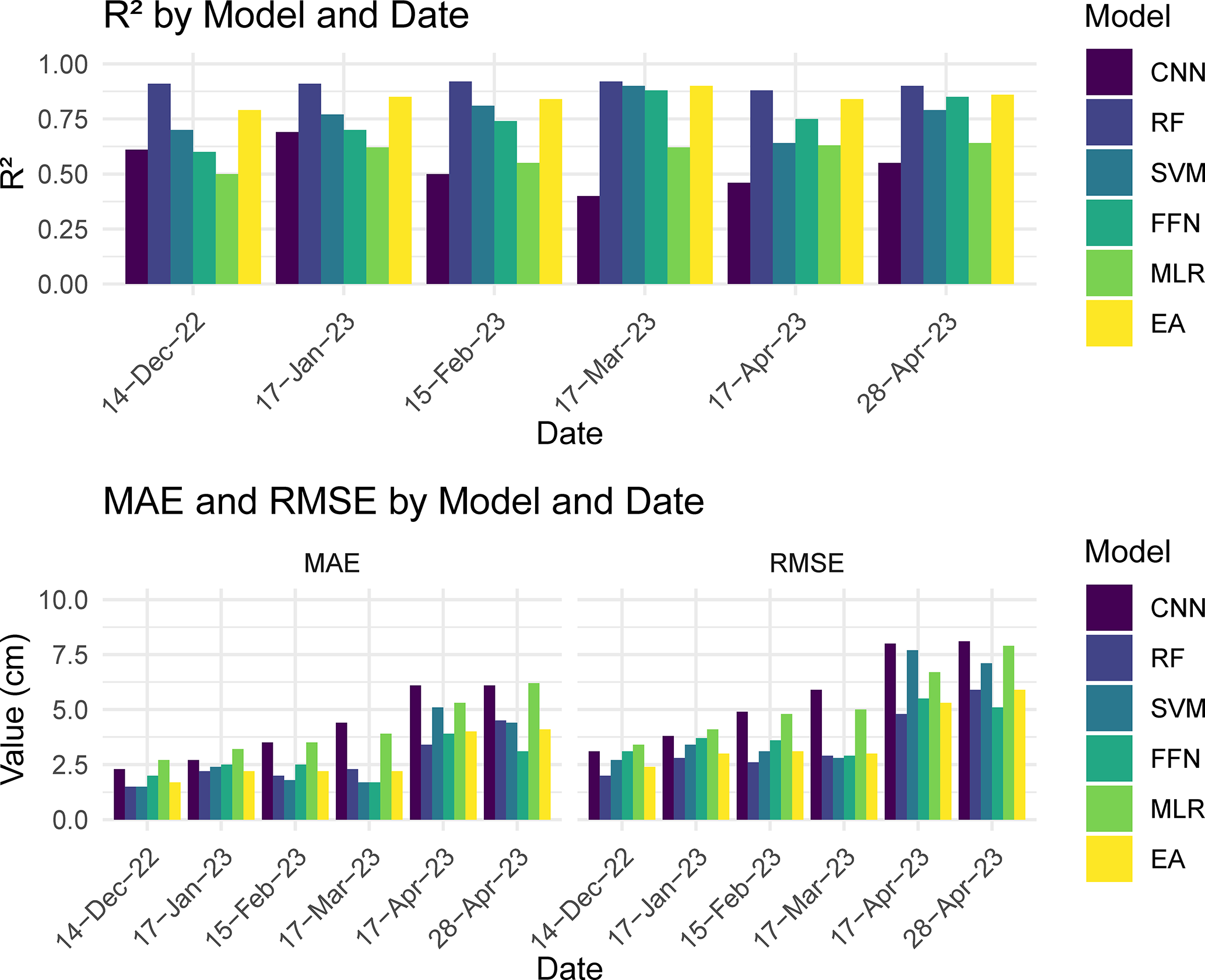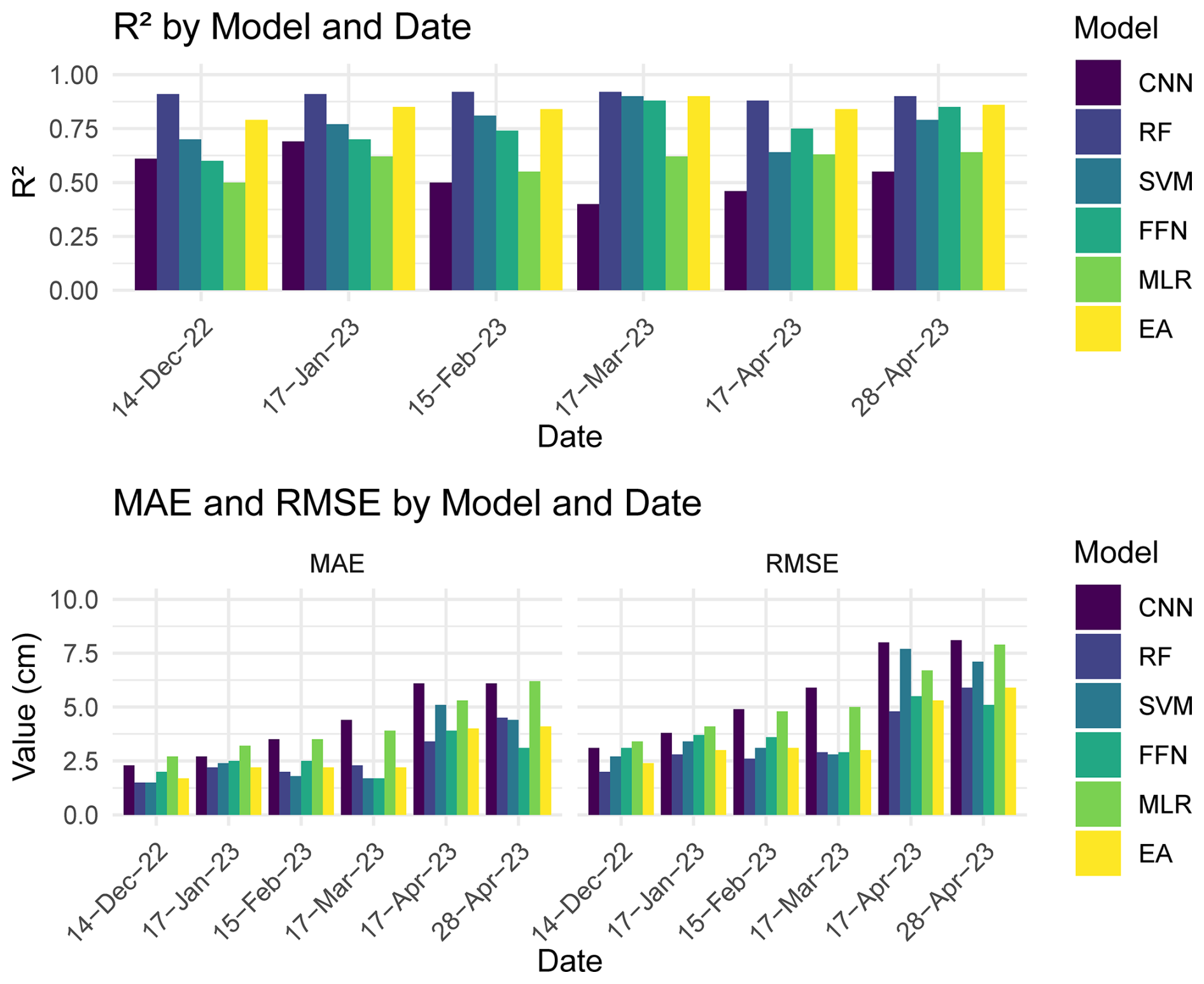 Figure 4Machine learning model metrics for estimated snow depth with CNN, RF, SVM, FFN, MLR, and EA. MAE and RMSE are in cm.