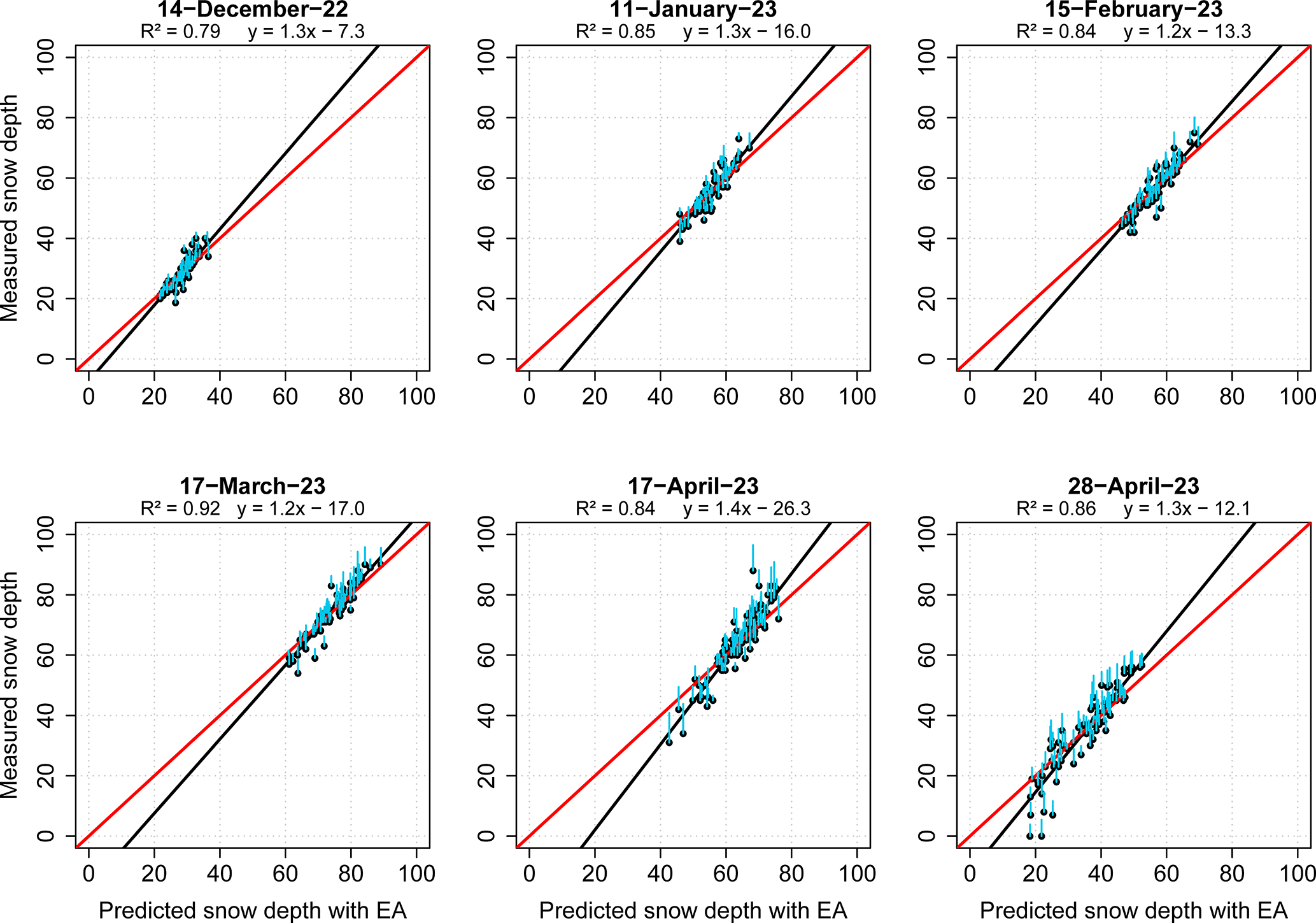 Figure 5Scatterplot, 1:1 line (red line), and fitted regression line (black line) between the predicted snow depth from EA and the measured snow depth on each occasion from 14 December 2022 until 28 April 2023. STDE is in cyan.