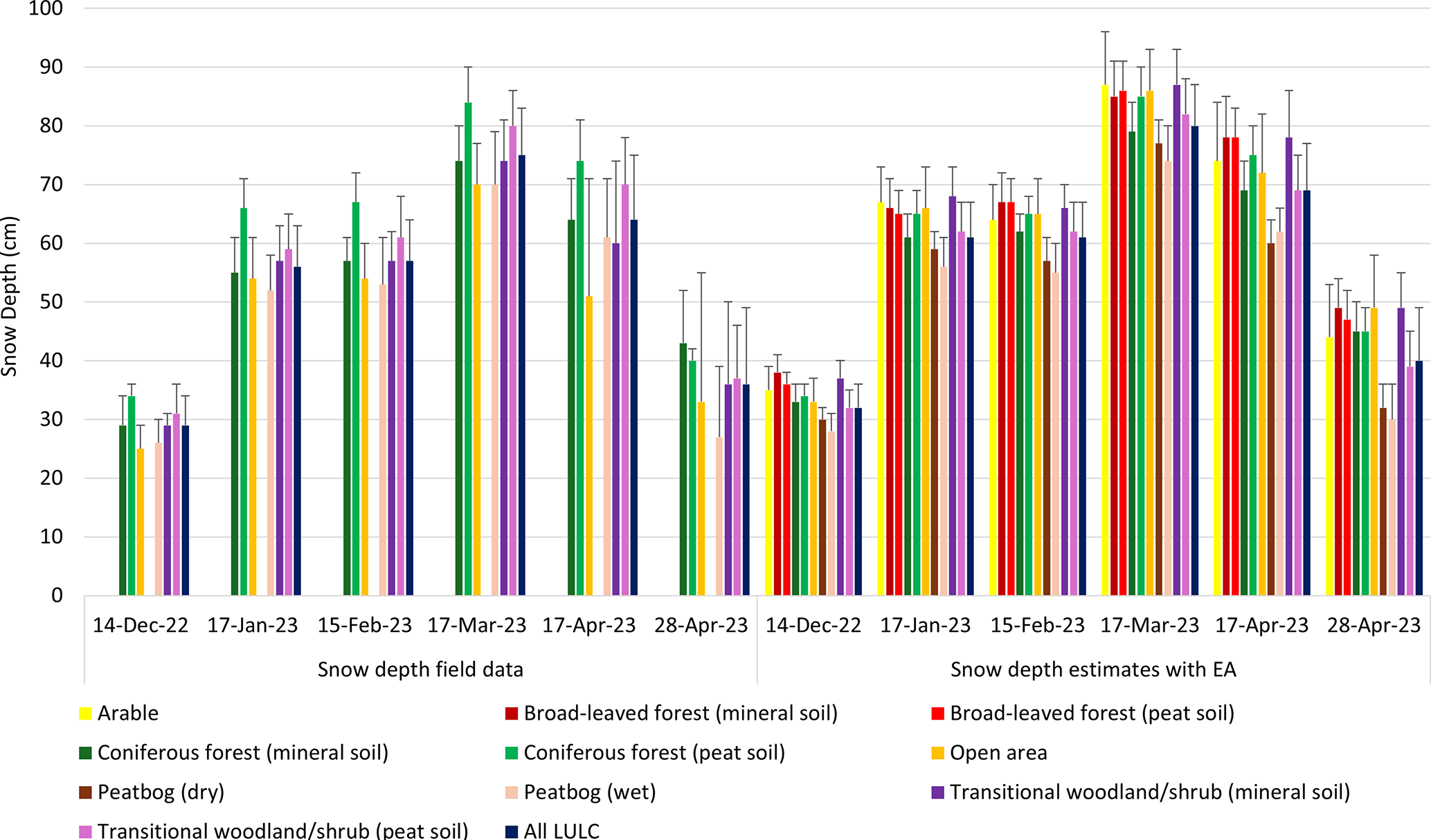 Figure 6Mean and standard deviation (error bars) for snow depth (cm) estimates per LULC with field data and at the local scale with EA. Blank values indicate no field data.