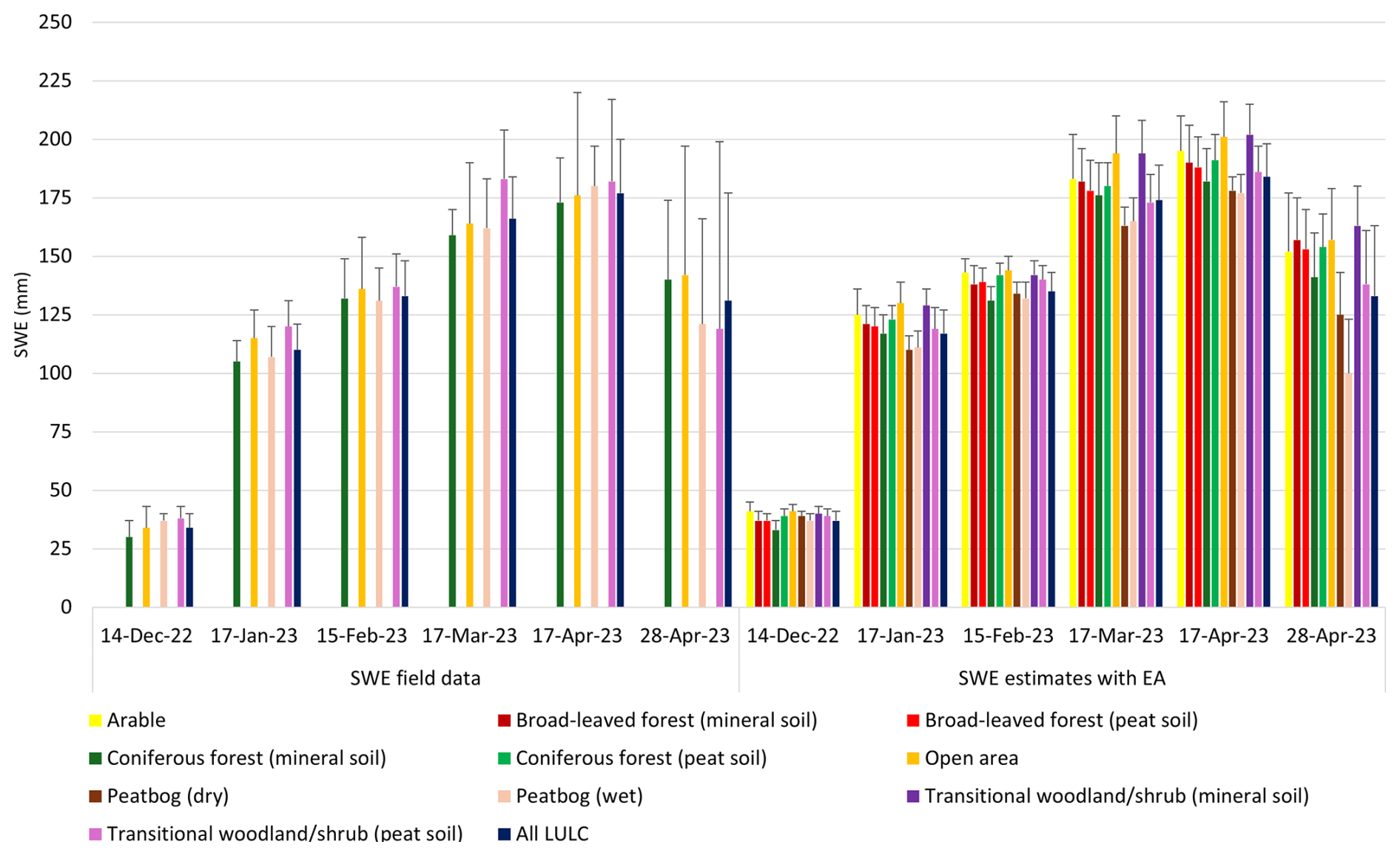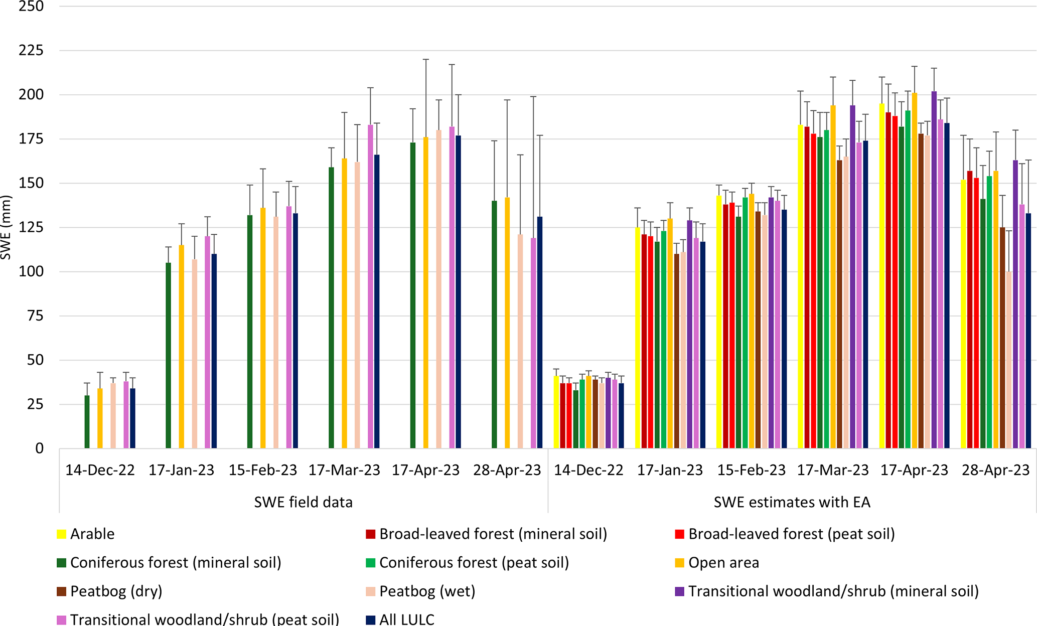 Figure 10Mean and standard deviation (error bars) for SWE (mm) estimates per LULC with field data and at the local scale with EA. Blank values indicate no field data.