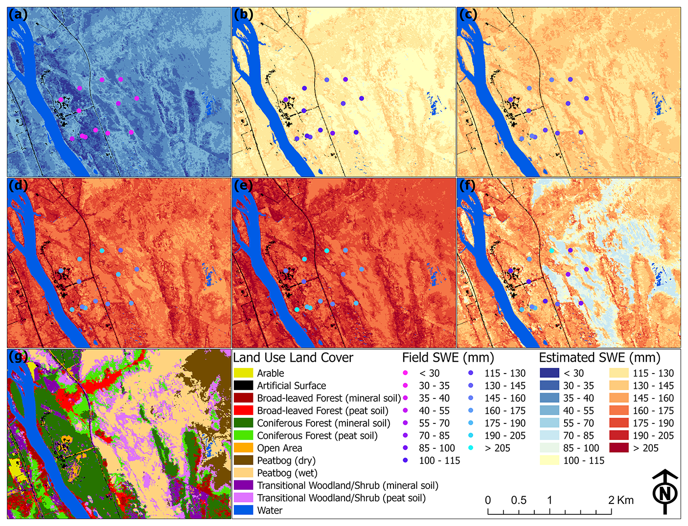 Figure 11Field and estimated SWE (mm) in (a) 14 December 2022, (b) 17 January 2023, (c) 15 February 2023, (d) 17 March 2023, (e) 17 April 2023, and (f) 28 April 2023 alongside (g) a LULC map.