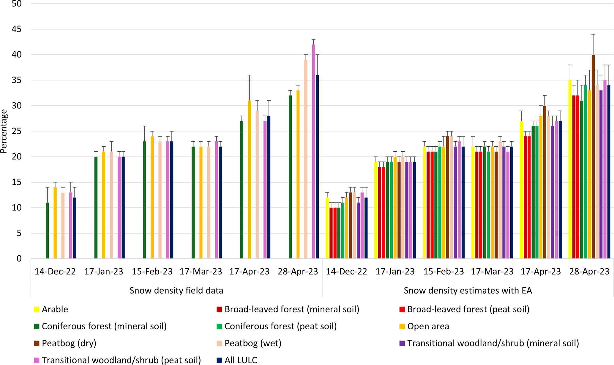 Figure 12Mean and standard deviation (error bars) for snow density percentage estimates per LULC with field data and EA. Blank values indicate no field data.