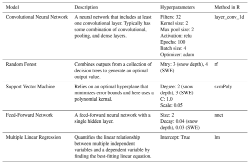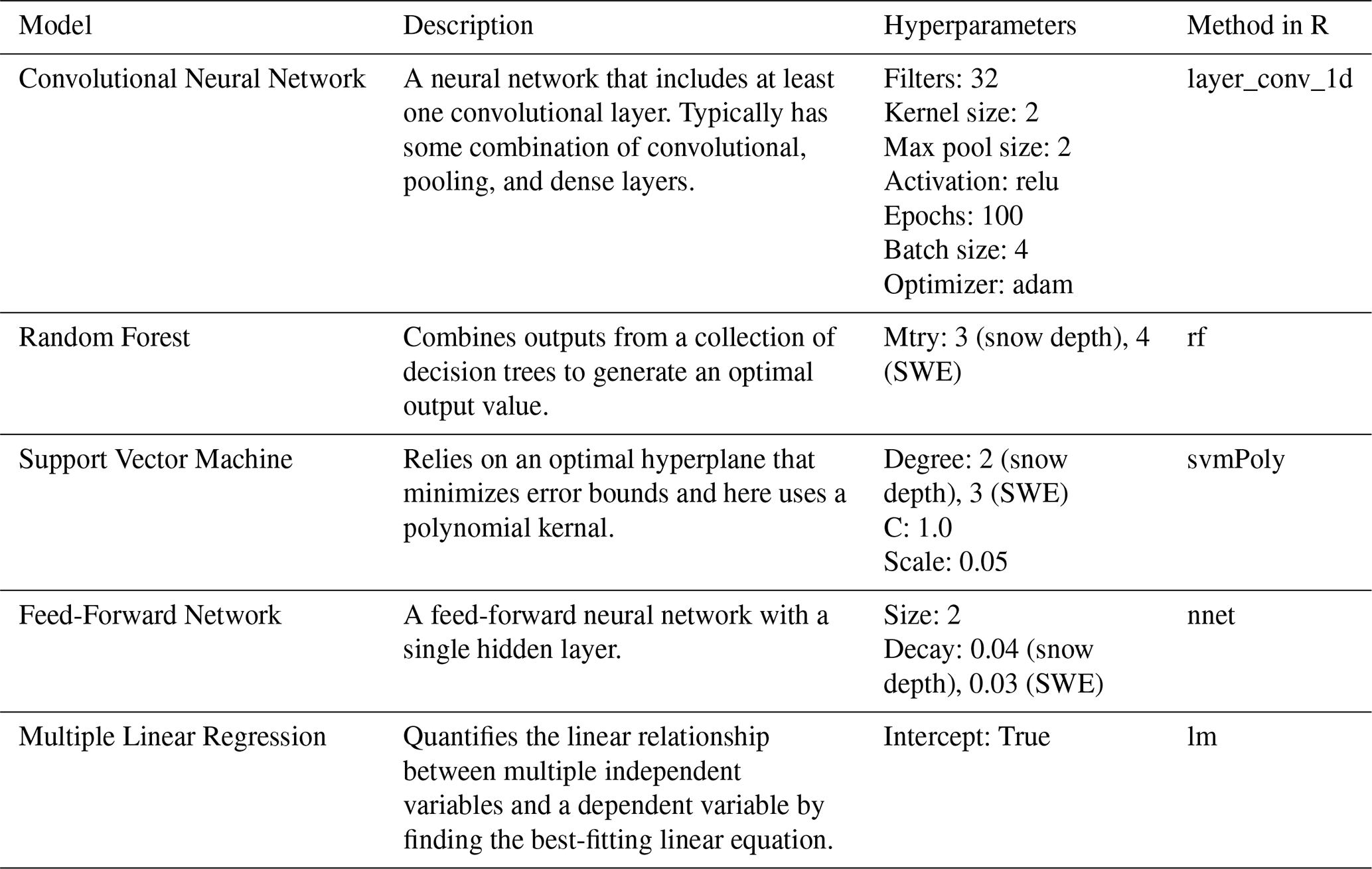In addition to a deep learning Convolutional Neural Network (CNN), other commonly utilized and unique supervised regression-based machine learning models entailing of Random Forest (RF), Support Vector Machine (SVM), Artificial Neural Network (ANN), and Multiple Linear Regression (MLR) were chosen to estimate snow depth and SWE for the image objects. RF works by training a large collection of decision trees to generate an optimal output via bootstrap aggregation (Hwang et al., 2023). In contrast, SVM is a supervised algorithm that relies on an optimal hyperplane that minimizes error bounds and seeks to identify a function that best predicts a continuous output value (Pimentel et al., 2021). ANN may be explained as a feed-forward Directed Acyclic Graph (DAG) connected with artificial neurons with nonlinear activation functions (Li et al., 2022). The architecture of the ANN machine learning model used in this manuscript was a feed-forward network (FFN) model with a single hidden layer. MLR models the linear relationship between independent variables to a dependent variable by finding the best-fitting linear equation (Kim et al., 2020). CNN is a more advanced ANN model that includes at least one convolutional layer (Santry, 2023), though often contains some combination of convolutional layers, pooling layers, and dense layers. Here, a 1D CNN model was utilized as all models relied on the same tabular data provided from all image objects. The tuneGrid parameter found in the caret package in R was used to specify a grid of hyperparameter values for tuning the model training process to optimize machine learning performance. Further details on the hyperparameter values can be found in Appendix A. To aid in reducing potential modeling bias and overfitting, a k-fold cross-validation technique was employed. With this, matched data samples are randomly split into k number of subsets, with k−1 being utilized to train models and the remainder to test models (Abriha et al., 2023). Here, a k-fold of 10 was utilized whereby in each subset 90 % of the data is assigned for training and 10 % is for testing, with model performance determined from the average of all iterations. Thus, each subset of randomly split data is utilized for testing only once, before rejoining the training set. For preprocessing, all inputs were standardized with centering and scaling leading to attributes containing a mean value of 0 and a standard deviation of 1. Subsequently, Principal Component Analysis (PCA) was utilized prior to running each model, which also aided to lessen model overfitting. A threshold of 95 % of the variance captured was set for PCA to ensure that the number of chosen components would sufficiently represent the variance of the data. The result was 17 components for snow depth and 9 components for SWE.