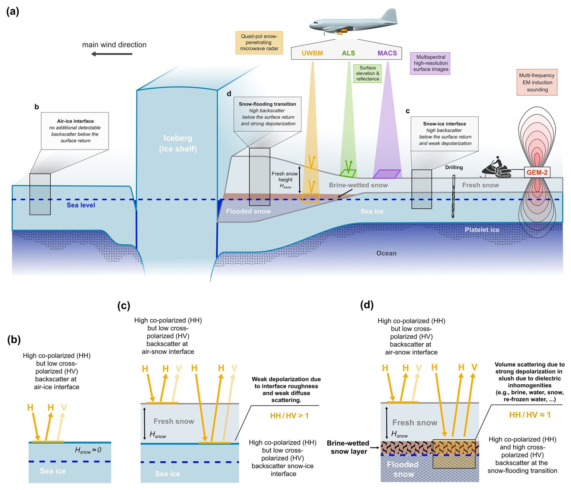 Figure 3(a) Cross-section of the landfast sea ice and sketch of the measurements used in this study, as well as aspects of iceberg-influenced sea ice in Atka Bay and the prevailing snow distribution. The drawings in the bottom row (b–d) illustrate the observations and interpretations of scattering characteristics in the UWBM radar data at different material transitions (e.g., bare ice, snow-to-ice transition, or fresh-snow-to-flooded snow transition).