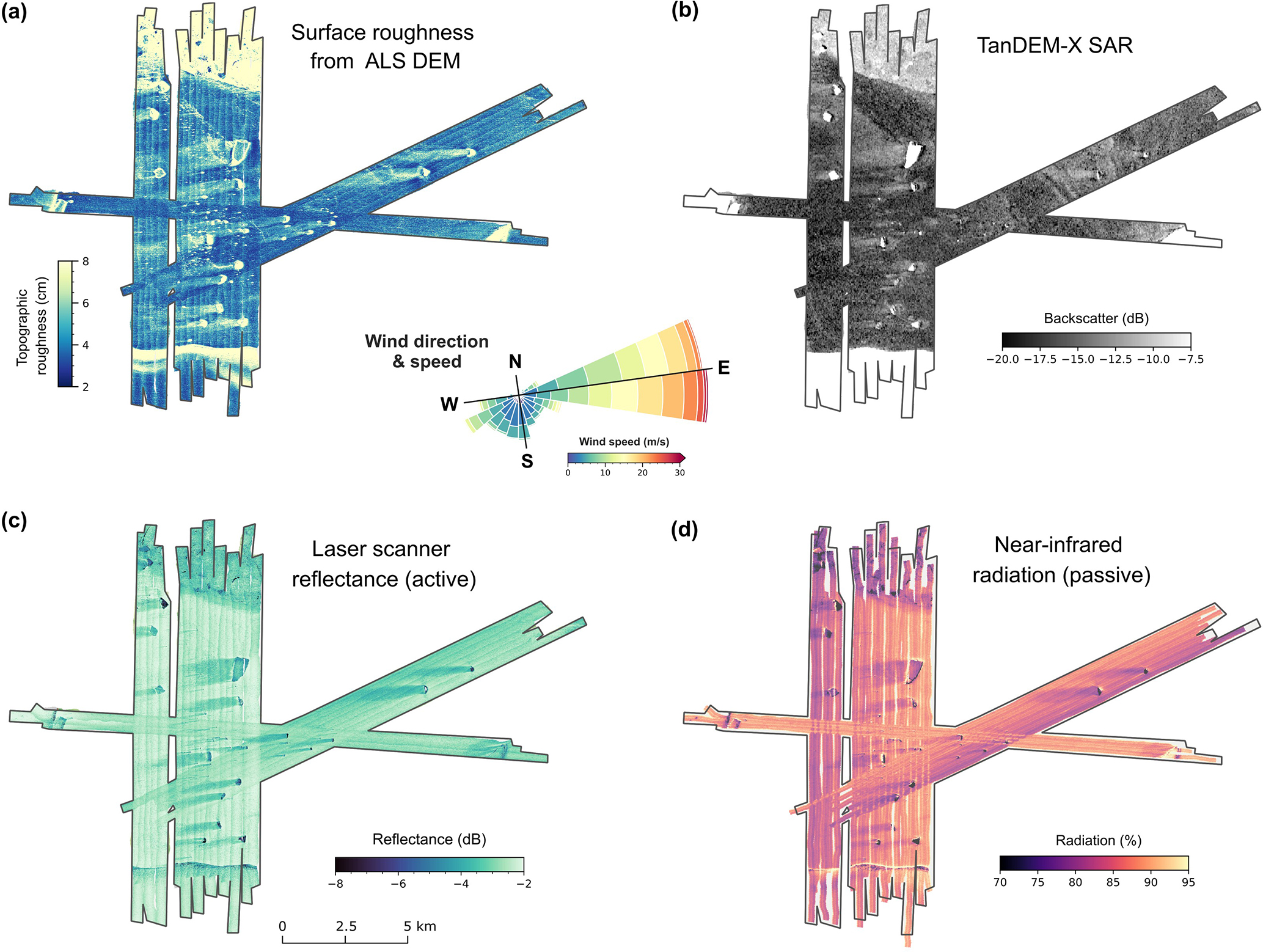 These distinct snow elevation patterns created by the icebergs coincide closely with the radar backscatter patterns in the SAR images (Fig. 2d, e), providing compelling support for their interpretation. The leeward high-backscatter regions coincide with regions of thin snow and relatively large topographic roughness arising from small-scale surface variations in the ALS DEM (Figs. 2d, e and 4a, b). The leeward regions also show pronounced reductions of the ALS reflectance and MACS near-infrared radiation data compared to the surrounding regions with more snow (Fig. 4c, d). In addition, thick wind-facing and lateral snow drifts also coincide with increased backscatter regions in the SAR data.