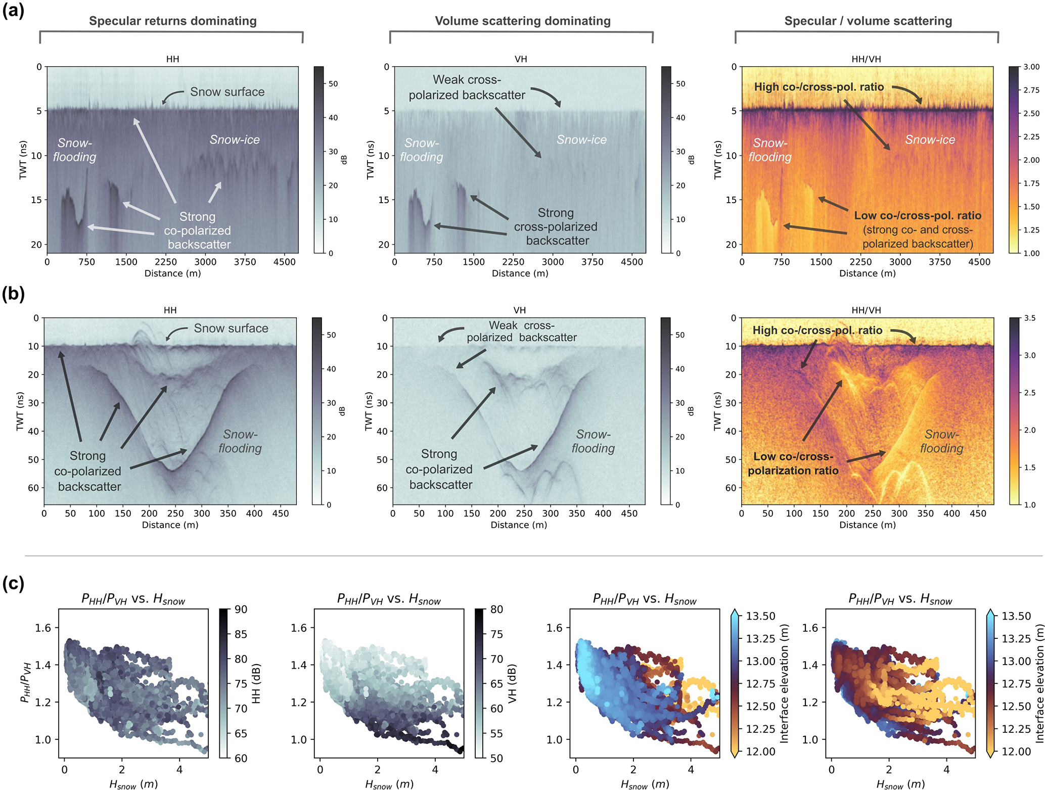 Backscatter horizons, which appear at shallow depths below the surface return, are characterized by moderate backscatter strength in co-polarized channels and significantly lower backscatter strength in cross-polarized channels (Fig. 6a, b). This suggests a transition between two homogeneous bulk dielectric media (within the UWBM wavelength range) with low surface roughness at the interface, most likely corresponding to the snow–ice interface. A potential layer of highly saline snow at the base of fresh snow of a few centimeter thickness, resulting from brine wicking (Nandan et al., 2017, 2019; Mallett et al., 2024), would lead to increased volume scattering and, thus, stronger EM wave depolarization. However, we consider its contribution to depolarization to be significantly smaller than that observed in flooded regions, making it clearly distinguishable in the radar signal. This interpretation is further supported by the fact that these interfaces with low co-/cross-polarized ratios are systematically located above sea level (Fig. 6c) and are associated with thin snow layers and low elevations in the ALS DEM.