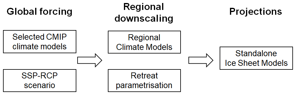Figure 1General forcing approach for Greenland ice sheet model projections. The questions relevant for the MME design (detailed in Table 2) are related to the modelling choices made for each of the boxes.