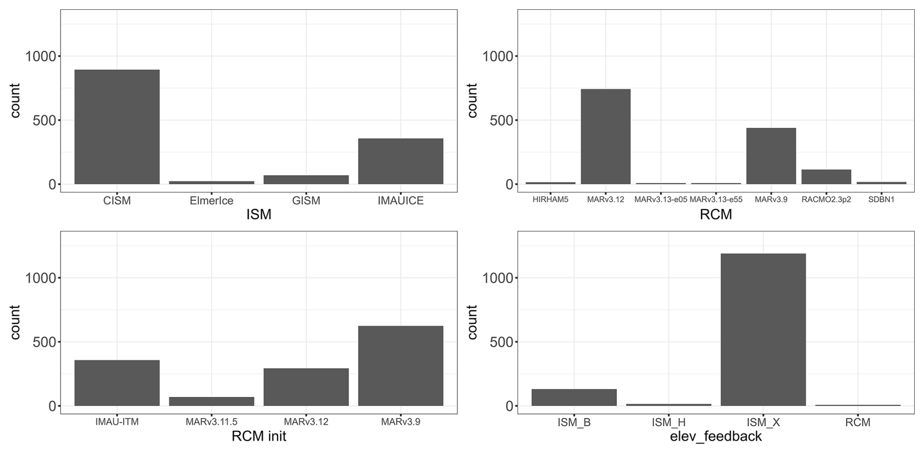 Figure 2Count number of the MME members with respect to the different inputs classified as “categorical” in Table 1: ISM (ice sheet model), RCM (regional climate model used for downscaling climate projections), RCM init (regional climate model used for initialisation climate), and elev_feedback (approach to representing the feedback between the ice sheet surface elevation and climate).