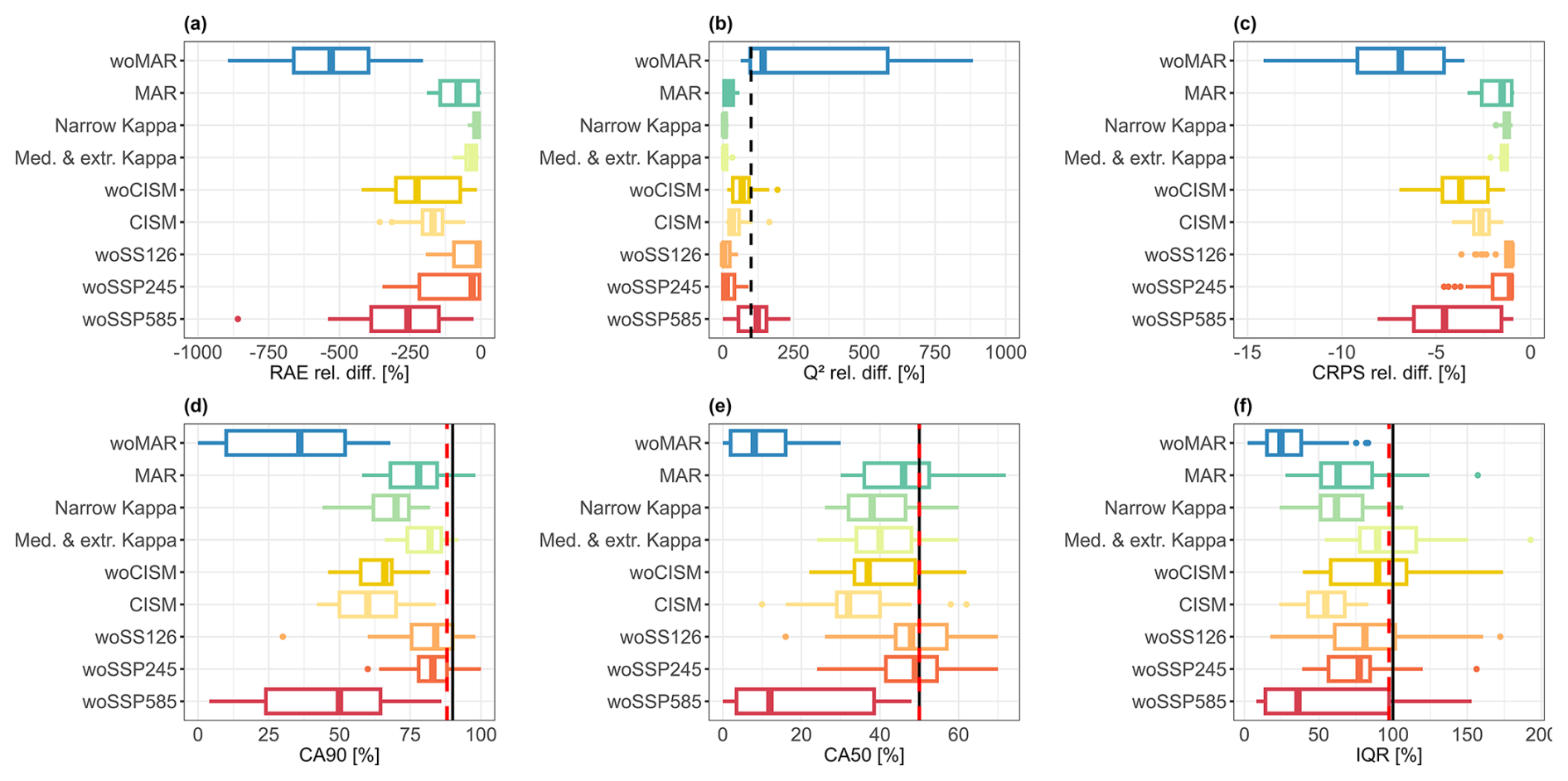 the influence of the “woCISM” experiment ranks third, with a decline in predictive capability on the same order of magnitude than that of “woSSP585” or “woMAR”, particularly in terms of RAE (Fig. 8d), but with higher reliability of the prediction intervals (Fig. 9, bottom);