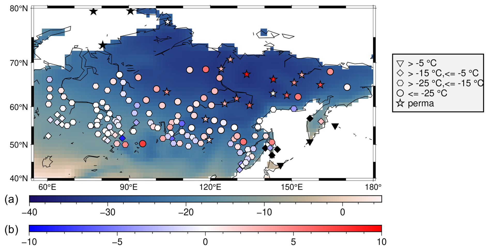 Northern Eurasia contains more than two-thirds of the Earth's permafrost area (Groisman and Bartalev, 2007), with the majority located in Siberia. The potential degradation of permafrost in Siberia could have far-reaching consequences for climate and ecosystems throughout Eurasia and globally (Schuur et al., 2015; Streletskiy et al., 2025). Within this region, we used the soil temperature observational dataset at standardized depths, as provided by the All-Russian Scientific Research Institute of Hydrometeorological Information-World Data Center (RIHMI-WDC; Frauenfeld and Zhang, 2011; Sherstyukov, 2012a; Zhang et al., 2018).