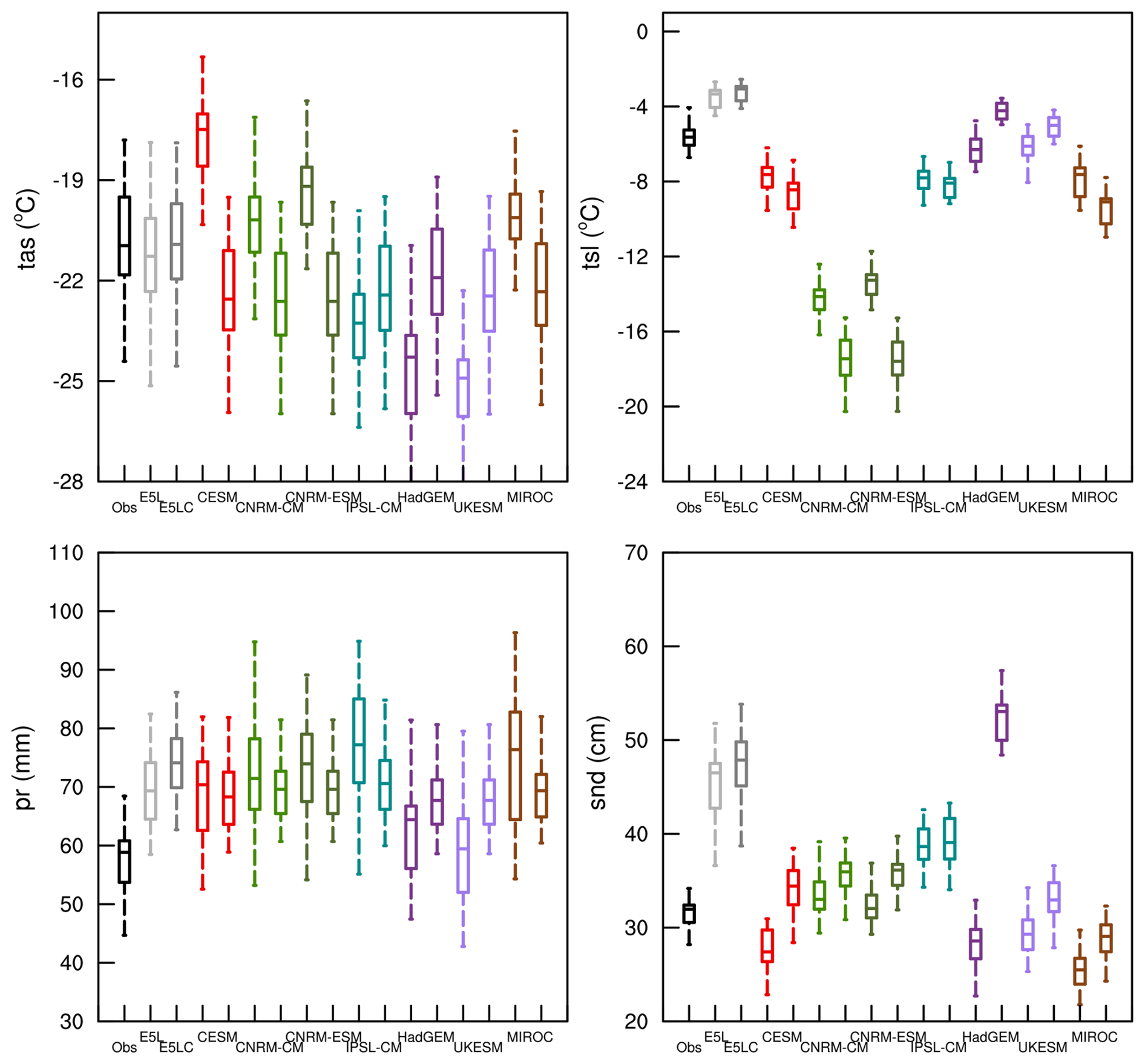 In both CMIP6 and LS3MIP runs, the DJF pr values were typically 10 mm higher than in the observations. UKESM1.0-LL simulated relatively good pr in CMIP6, with less than 3 mm overestimation in DJF average. The observed DJF snd was approximately 30 cm. It was overestimated by 70 % in HadGEM3-GC31-LL (LS3MIP run) and by 50 % in E5LC. Overall, the models were diverse in simulating DJF medians snd, with high temporal variability.