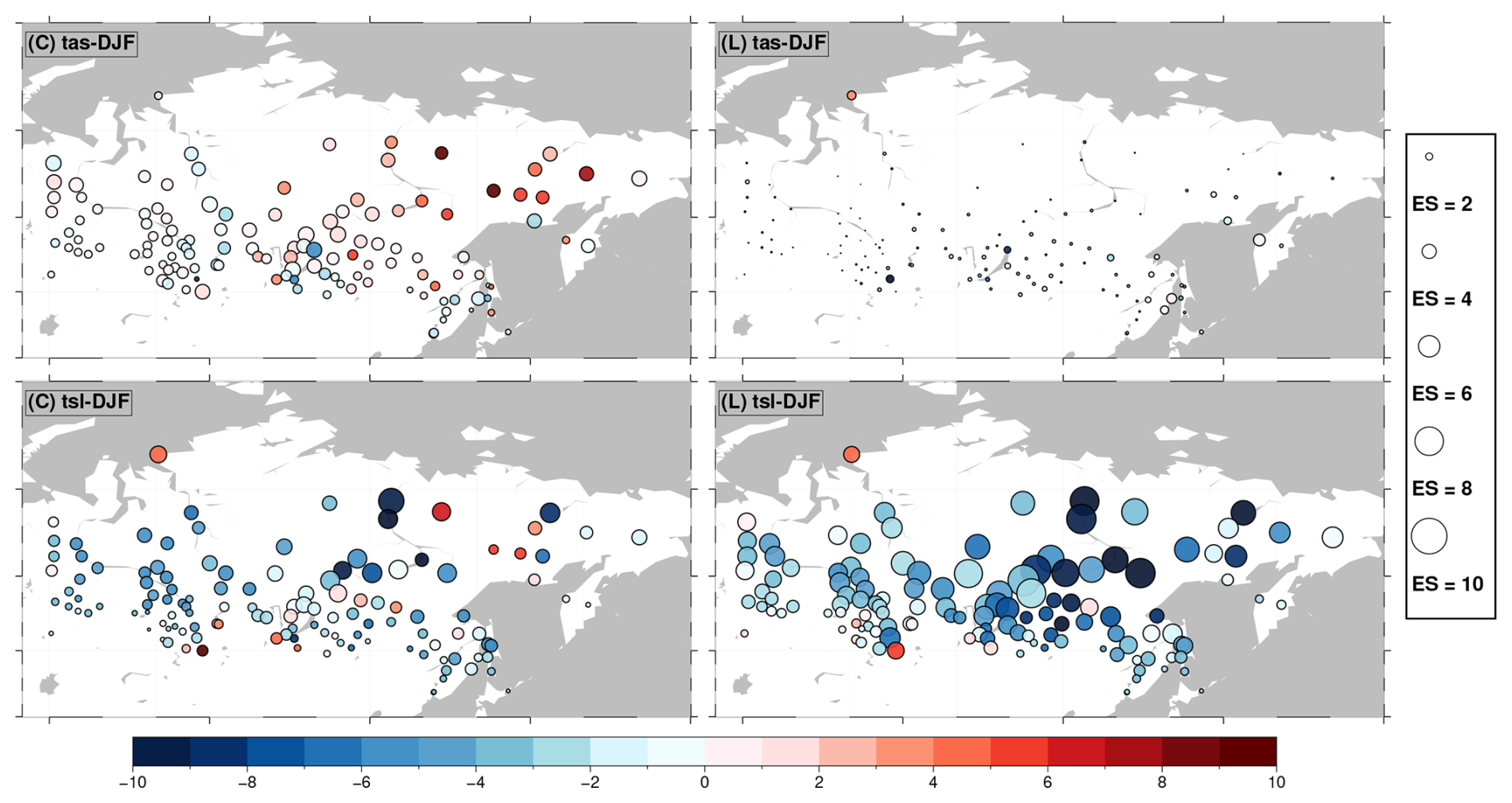 Figure 5Weighted DJF multi-model mean biases (EB) and their standard deviations (ES) of tas and tsl at observational sites in °C. The top-left subtitles of each subplot indicate the presented model ensemble (C for CMIP6 and L for LS3MIP), the variable, and the season. Colors indicate the bias value (in °C), while the circle radii represent biases' standard deviations (in °C), i.e., the ensemble spread.