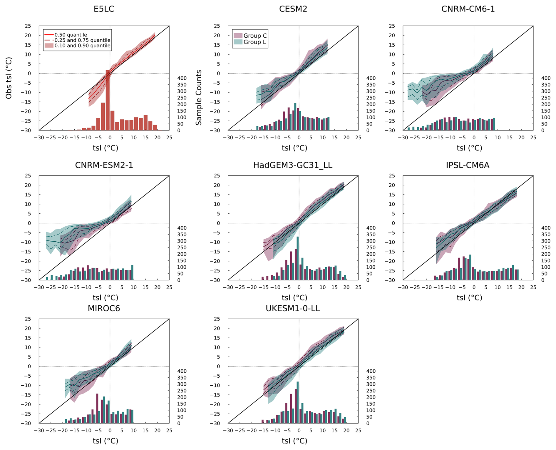 Larger model biases and discrepancies were found in permafrost regions. To evaluate how model errors depend on the temperature conditions, we categorized all the model outputs of tas and tsl based on their values and compared these outputs to the corresponding observations. For each model, the monthly data from every site was calculated as an average over 30 years. We then examined the corresponding values for the same site and month with valid observations, calculating the median values, quartiles, and deciles for each interval.