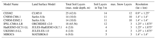 Table 1Selected CMIP6/LS3MIP experiment pairs, the layering and resolution. For other features and references, see Table 2.