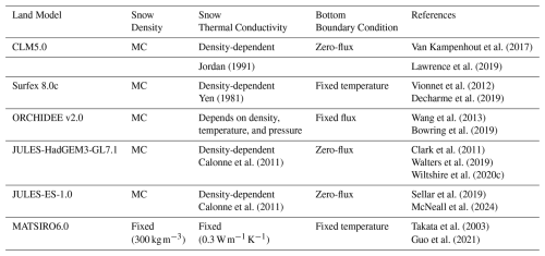 Van Kampenhout et al. (2017)Jordan (1991)Lawrence et al. (2019)Vionnet et al. (2012)Yen (1981)Decharme et al. (2019)Wang et al. (2013)Bowring et al. (2019)Clark et al. (2011)Calonne et al. (2011)Walters et al. (2019)Wiltshire et al. (2020c)Sellar et al. (2019)Calonne et al. (2011)McNeall et al. (2024)Takata et al. (2003)Guo et al. (2021)Table 2 highlights several attributes of each land model, focusing on their key characteristics related to the surface energy balance and associated processes. For a more general comparison of land-only models and their features regarding snow parameterization, see Menard et al. (2021). The land models differ in their representation of critical processes related to surface energy balance, snow physics, boundary conditions, and surface organic matter. The thermal conductivity of snow is modeled using density-dependent formulations as a power function (Yen, 1981) or a quadratic function (Jordan, 1991; Calonne et al., 2011; Wang et al., 2013), or using fixed values. Snow density is treated either dynamically through mechanical compaction (MC) or as a constant. The soil bottom boundary is handled with zero-flux assumption, fixed temperature, or fixed temperature gradients.
