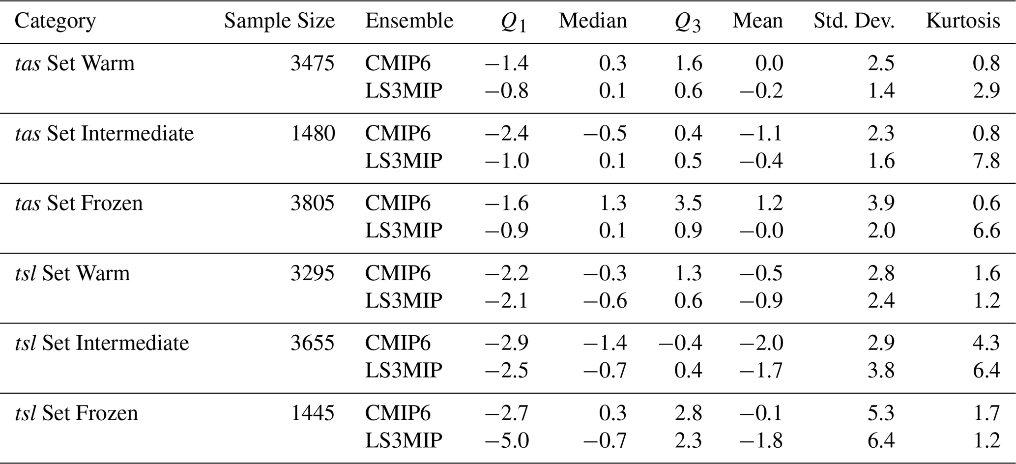 We applied additional statistical analysis to the temperature variables of CMIP6 and LS3MIP ensembles, focusing on temperature states, including interquartiles, medians, means, standard deviations, and kurtosis. The kurtosis characterizes the shape of a distribution, where a value of 0 indicates a normal distribution. When the standard deviations are comparable, a higher kurtosis indicates a distribution with heavier tails, i.e., more extreme deviations from the mean.
