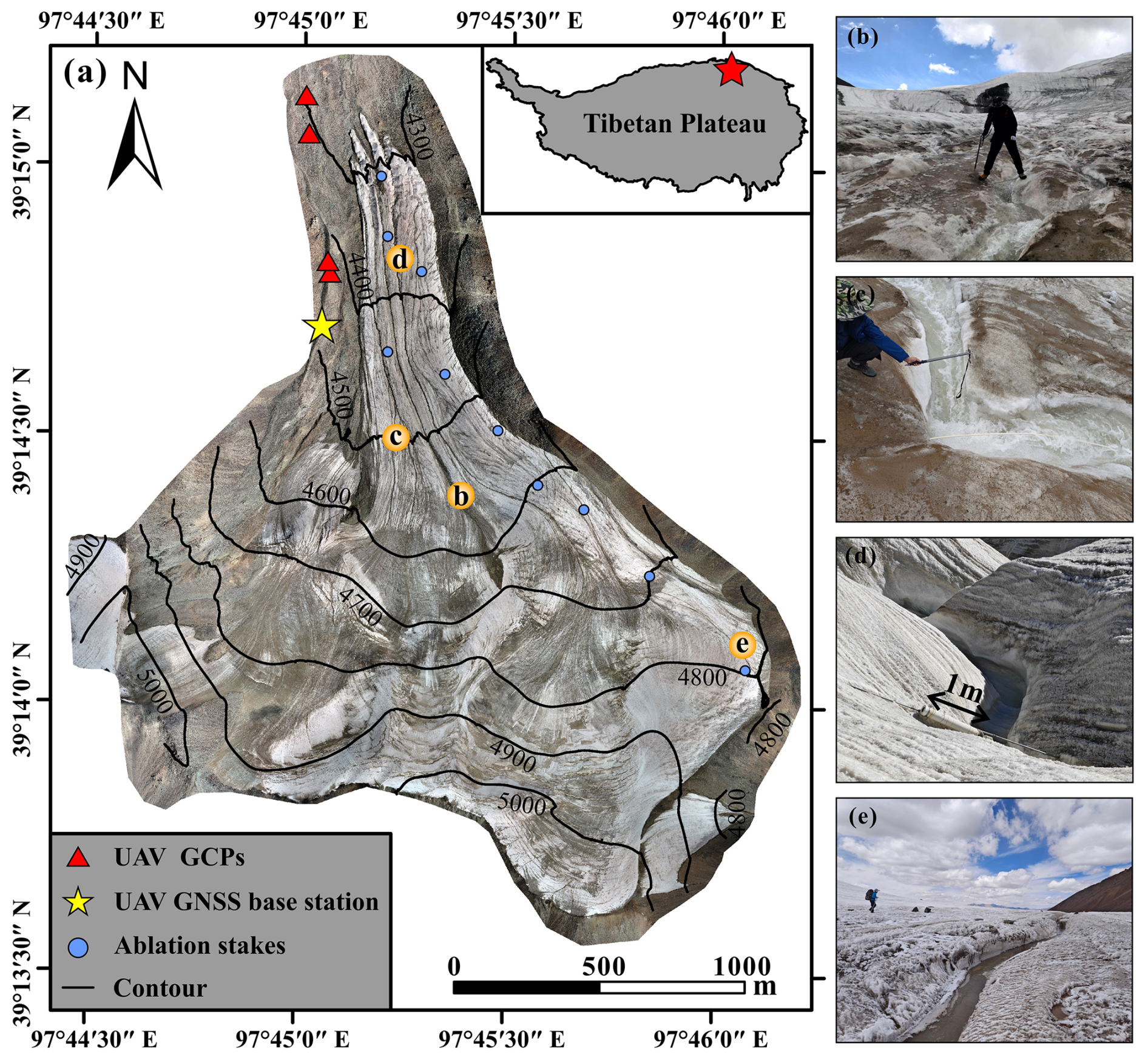 Figure 1Location of the Qiyi Glacier and photos of its typical supraglacial stream channels. (a) Orthomosaic map of the Qiyi Glacier generated from UAV data (5 cm spatial resolution), with red triangles marking the locations of ground control points (GCPs) each with a fixed solution for UAV flights, yellow stars indicating the Global Navigation Satellite System (GNSS) base station of UAV, blue dots representing the locations of ablation stakes on the glacier, and orange circles showing the locations where photos (b)–(e) were taken.